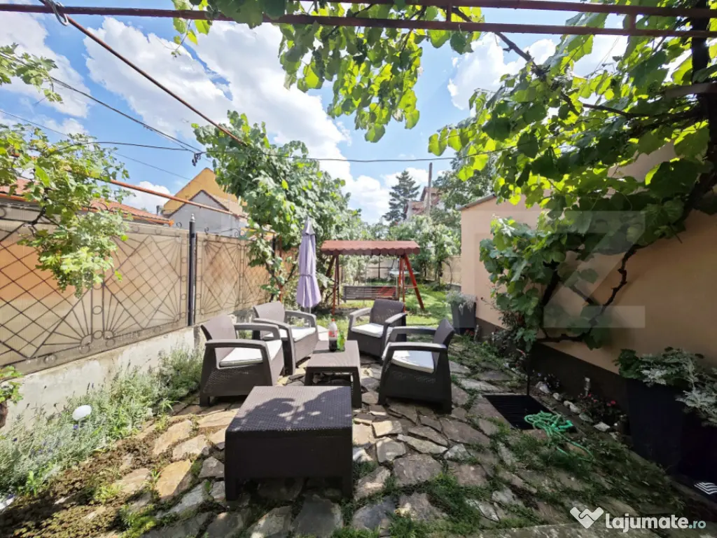 Compartimentare practică: 2 dormitoare mari, living cu bucătărie open space, baie modernizată, cămară și spații de depozitare. Intrare separată în curte și în apartament. Parcare în fața casei.