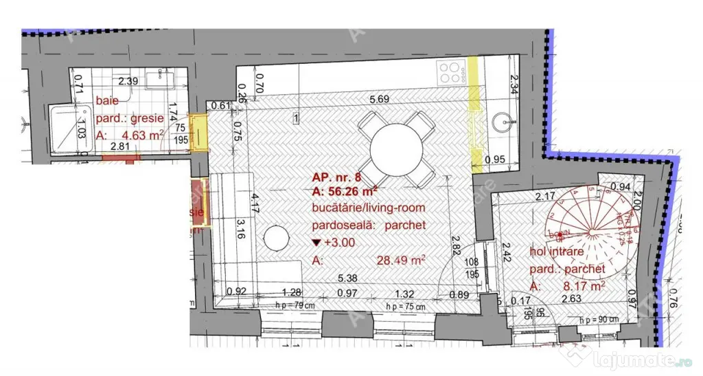 Locuinta masoara 56.26 mp utili, aceasta este dispusa pe doua niveluri cu scara interioara, aceasta este alcatuita la parter din camera de zi tip open space cu bucataria de 28,49 mp, baia 4.63 mp dotata cu cabina de dus si holul de acces 8.17 mp unde este pozitionata scara din lemn masiv prin intermediul careia se face accesul la al doilea nivel care este compus dintr-un hol si un dormitor generos de 14,97 mp.