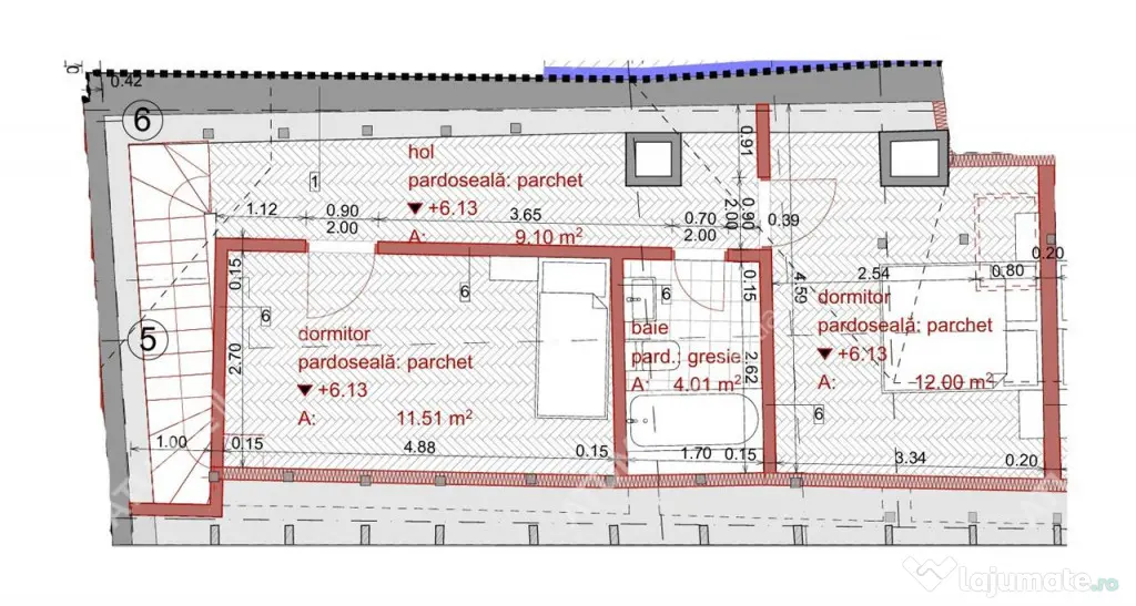 -Pardoseala placata cu parchet din lemn triplu stratificat si gresie iar peretii baii placati cu faianta,