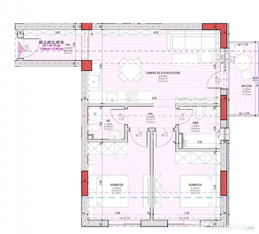 Apartamentul are o suprafata utila de 62,18 mp si este compus dintr-o camera de zi cu bucatarie open space de 24,00 mp, doua dormitoare de aproximativ 12 mp fiecare, o baie de 4,20 mp dotata cu cada si geam pentru aerisire naturala, o toaleta de serviciu si un hol generos cu spatiu pentru cuier si pantofar.