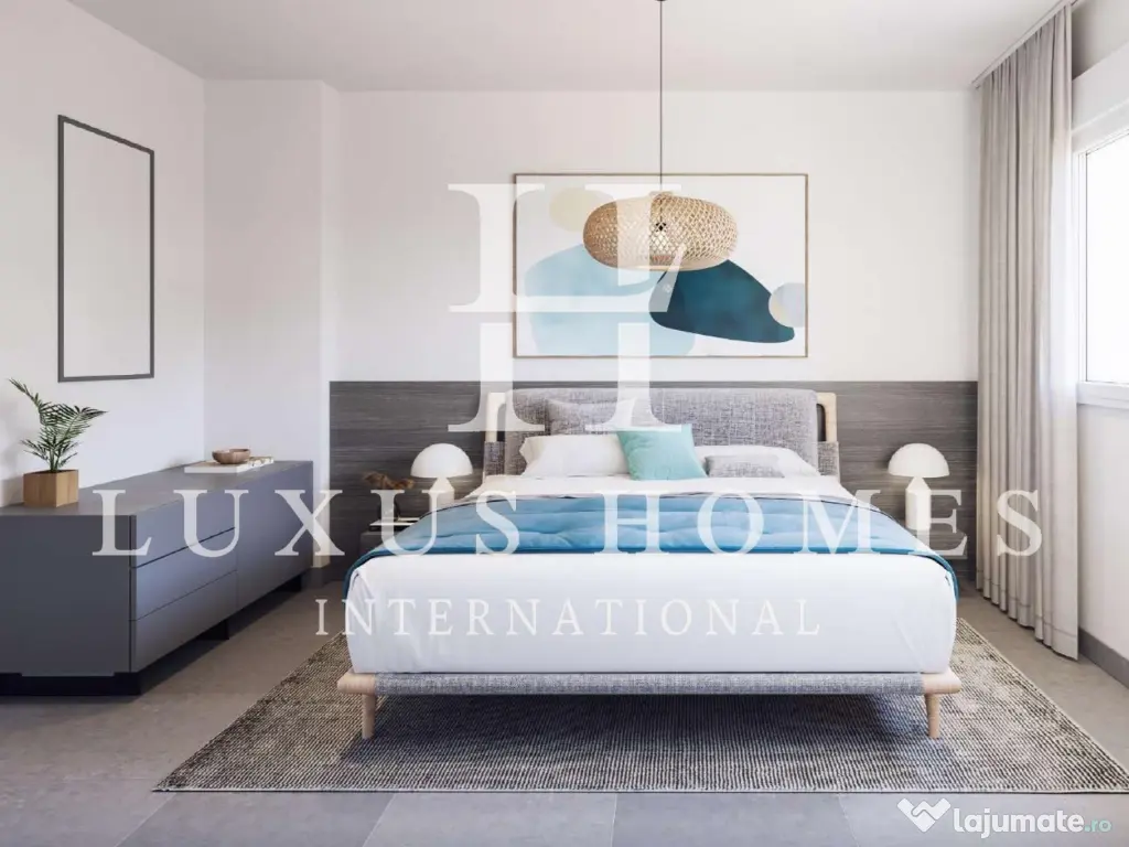 Apartament la parter, cu piscină, terasă și vedere la mare, lângă plaja.
