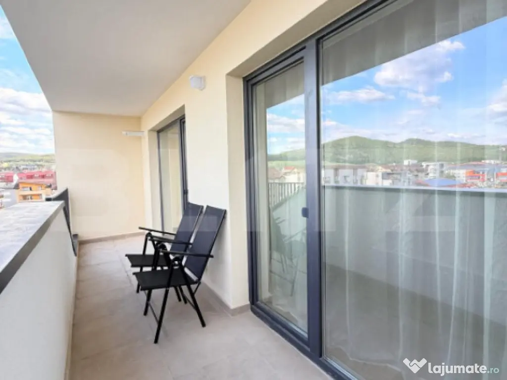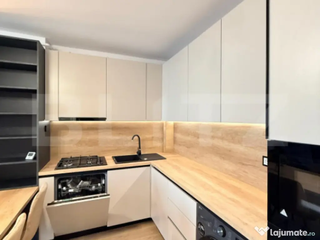Apartamentul este poziționat la etajul 1 al unui imobil cu 8 etaje, într-o clădire îngrijită și bine construită. Acesta dispune de o suprafață utilă de 45 mp, la care se adaugă o terasa de 10 mp, ideala pentru relaxare. Compartimentarea semidecomandată este eficient realizată și se prezintă astfel: living modern cu bucătărie open-space, dormitor luminos, baie complet echipată și hol cu spații de depozitare. Finisajele și mobilierul sunt de categorie superioară, apartamentul avand bucătărie complet mobilată, dotată cu electrocasnice încorporabile, living amenajat modern, dormitor mobilat funcțional si baie complet utilata. Locuința este foarte luminoasă și oferă o atmosferă primitoare, fiind potrivită atât pentru locuit, cât și ca investiție cu randament excelent. Opțional se poate achiziționa un loc de parcare subteran la prețul de 9.000 euro.