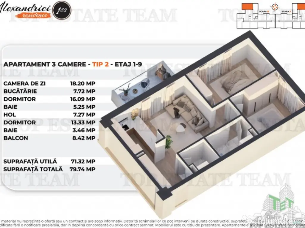 Cel mai important constructor din Ardeal este prezent cu primul proiect in Bucuresti Apartament cu 3 Camere la standard de confort si performanta ridicate pe Soseaua Alexandriei, Bucuresti, intr-un proiect in constructie sustinut de un dezvoltator cu peste 25 de ani de experienta si rezultate remarcabile. Fiecare locuinta din acest proiect este gandita cu grija atat pentru spatiul interior, cat si pentru mediul inconjurator, astfel incat cei care aleg achizitionarea unui apartament sa se simta cu adevarat acasa. Apartamentul are o suprafata utila de 71.32, suprafata totala de 79.74mp si este compartimentat dupa cum urmeaza: Camera de zi: 18.2 mp Bucatarie: 7.72 mp Dormitor: 16.09 mp Baie: 5.25 mp Hol: 7.27mp Dormitor: 13.33 mp Baie: 3.46 mp Balcon: 8.42 mp Detalii tehnice: Centrala imobil: Centrale montate in cascada, Viessman, Buderus sau Ariston. Structura rezistenta: Beton armat, planseu tip dala. Fundatie: Radier general. Pereti exteriori: Zidarie din beton celular autoclavizat, 30 cm. Pereti intre apartamente: Zidarie din beton celular autoclavizat, 25 cm. Pereti interiori: Zidarie din beton celular autoclavizat, 12,5 cm. Icirc;naltime utila nivel: 2,75 m. Fatade: Termosistem polistiren 10 cm cu tencuiala decorativa. Terasa: Hidroizolatie membrana PVC (Sika), termoizolatie vata minerala 20 cm. Instalatii electrice: Cupru. Tablouri electrice apartamente: Eaton. Finisaje interioare: Usa acces apartament: Metalica, Blindo 2, Pinum, cu toc metalic, structura din otel zincat, balamale reglabile si izolatie din vata minerala; inchidere in 3 puncte, culoare gri transversal. Usi interioare: Model Revers, structura perimetrala din lemn, panouri MDF laminat, culoare alba. Parchet: SPC, 6 mm, compatibil cu incalzire in pardoseala, Clasa 34, producator PINUM. Faianta baie: Placi ceramice 30x60 cm, model Living Beige, Ecogres. Gresie baie/bucatarie/balcoane: Ecogres, Pietre di Sardegna, Casalgrande Padana, Basaltina. Pardoseli spatii comune: Aceiasi producatori ca pentru gresie. Robinetarie: Hertz. Sanitare: Vas WC, lavoar, cada si dus Ideal Standard. Ferestre si usi balcon: PVC Salamander GreenEvolution 76 MD, 6 camere. Climatizare: Multisplit Gree. Icirc;ncalzire: Pardoseala, Uponor sau Rehau. Prize si intrerupatoare: Legrand sau Gewiss. Icirc;n apropierea exista o varietate de zone de interes: Centre comerciale importante Parcuri si spatii verzi, ideale pentru relaxare si activitati recreative Transport public rapid ndash; statiile de autobuz si tramvai sunt la doar cativa pasi, asigurand conexiuni rapide cu restul capitalei Scoli si gradinite, perfecte pentru familiile cu copii Restaurante, cafenele si locatii de divertisment, pentru o viata urbana vibranta si accesibila Confort: 1 Tip imobil: Bloc de apartamente Număr Băi: 2