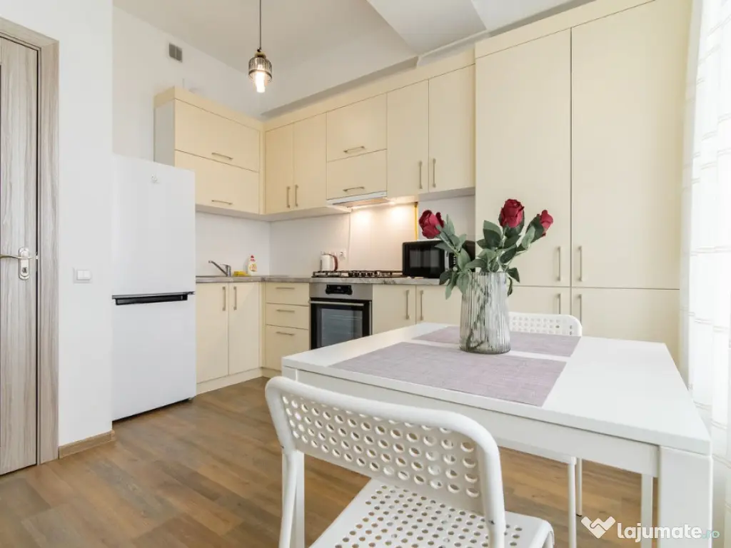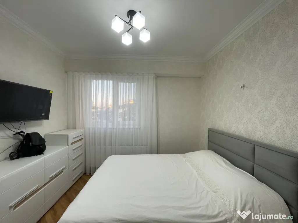 Va propunem spre inchiriere un apartament cu 1 camera complet mobilat si utilat, la etajul 1 intr-un imobil de 14 etaje, in cartierul Zorilor. Apartamentul este compartimentat astfel: - dormitor cu pat matrimonial, - bucatarie mare, - baie cu cabina de dus. Imobilul este dotat cu toate cele necesare- centrala proprie, masina de spalat haine, frigider, plita electrica, hota, TV, etc. Suprafta utila a imobilului este de 34 mp. Se afla in apropierea statiilor de transport in comun, magazine, restaurante, spatii verzi, farmacii, etc Confort: 1 Tip imobil: Bloc de apartamente