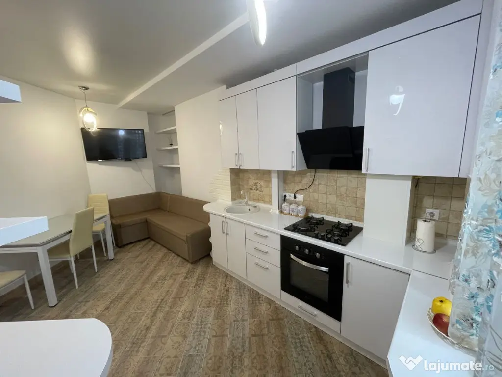 Ofer spre inchiriere o garsoniera situata in zona strazii Parang, din cartierul Manastur. Aceasta este pozitionata la etajul 6 al unui imobil cu 10 niveluri si dispune de o suprafata utila de 35 de mp. Compartimentarea garsonierei este semidecomandata si dispusa astfel: o camera, bucatarie, hol, o baie si un balcon inchis. Beneficiaza de geamuri termopan cu tamplarie din PVC si usa metalica la intrare. Garsoniera se ofera spre inchiriere complet mobilata si utilata. Confort: 1 Tip imobil: Bloc de apartamente
