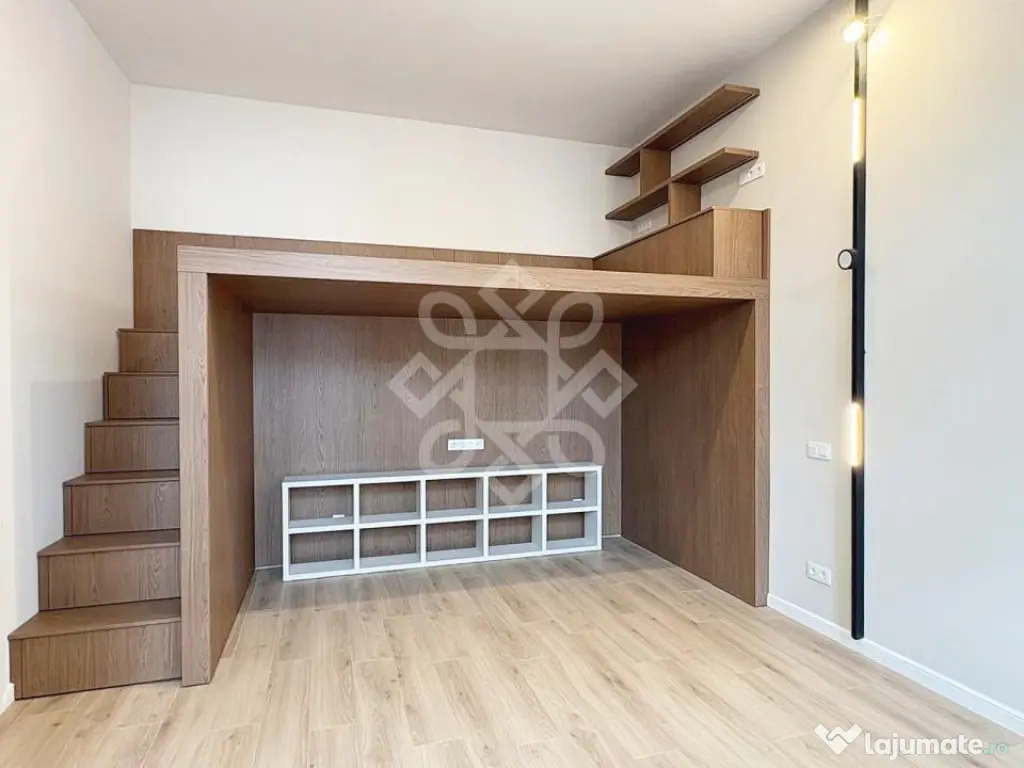 La parter regasim o bucatarie spatioasa si luminoasa, cu tavane inalte si mobilier realizat la comanda, perfect integrat in arhitectura spatiului. Zona de zi continua cu un living primitor, completat de un mezanin facut la comanda, ideal ca spatiu de dormit. Tot aici se afla o baie mare, cu cada, ce dispune de multa lumina naturala.