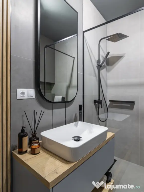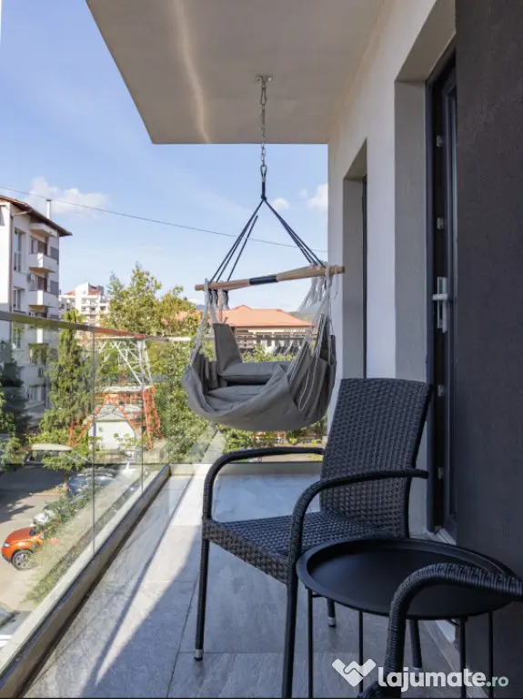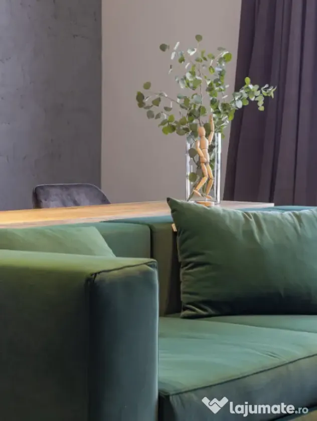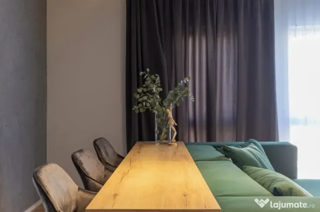 Locuința este închiriată full mobilată și utilată la standarde premium: două televizoare 4K, cuptor electric, plită, cuptor cu microunde, frigider, mașină de spălat și uscat rufe, mașină de spălat vase, hotă, set complet de veselă și tacâmuri, lenjerii, prosoape, perne și plapumă. Toate utilitățile sunt active: gaz, curent, internet și TV Digi, apă Vital.