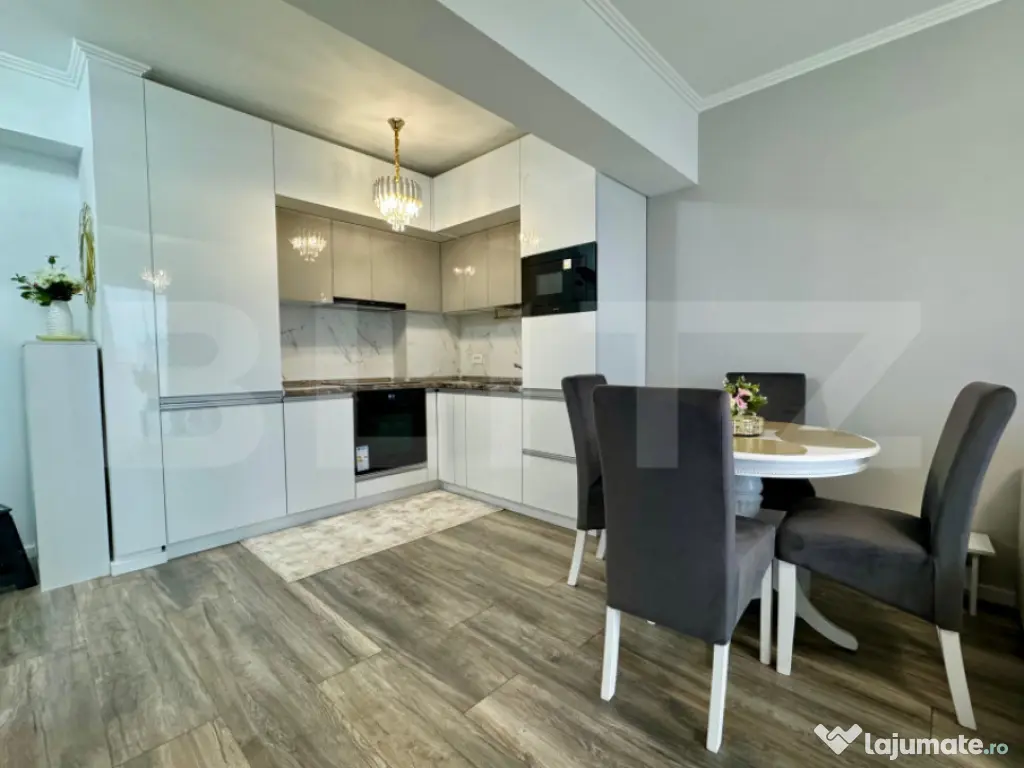 Locuința este nouă, nelocuită, amenajată și mobilată, cu finisaje premium și electrocasnice de ultimă generație: plită cu inducție, cuptor electric, frigider și cuptor cu microunde incorporabile, mașină de spălat vase, mașină de spălat rufe, aer condiționat și televizor. Totul este pregătit pentru mutare imediată, fără investiții suplimentare.
