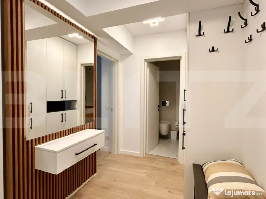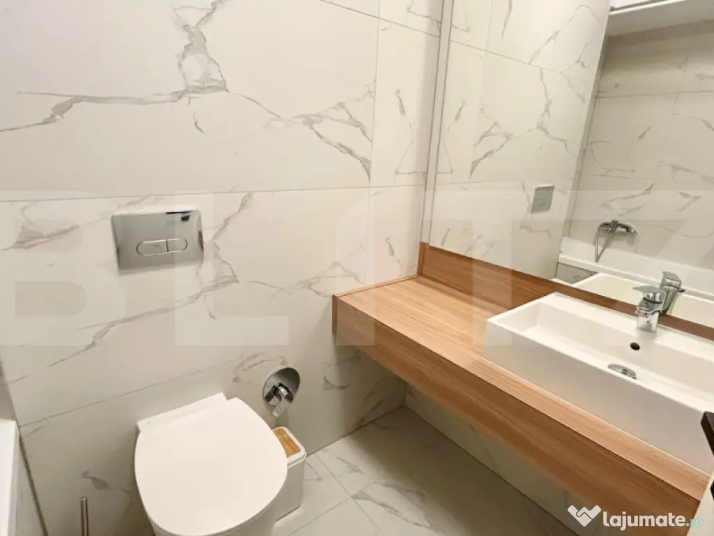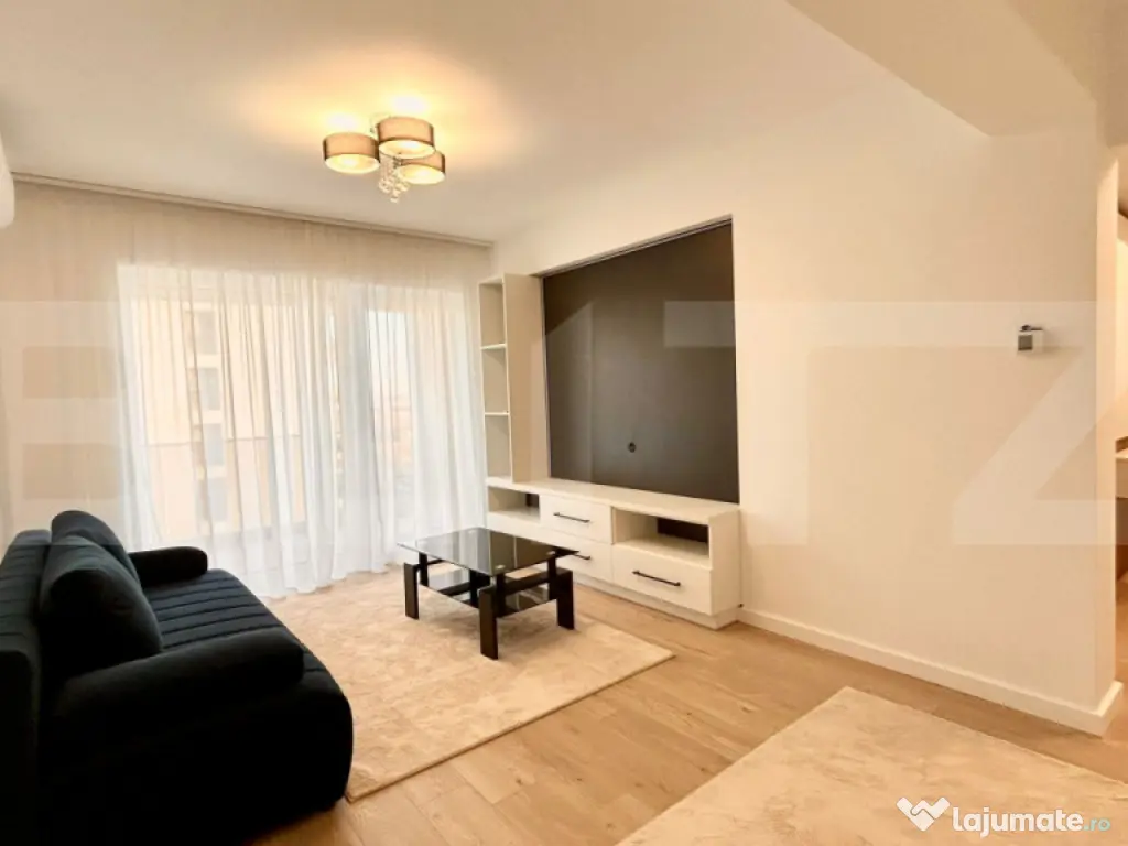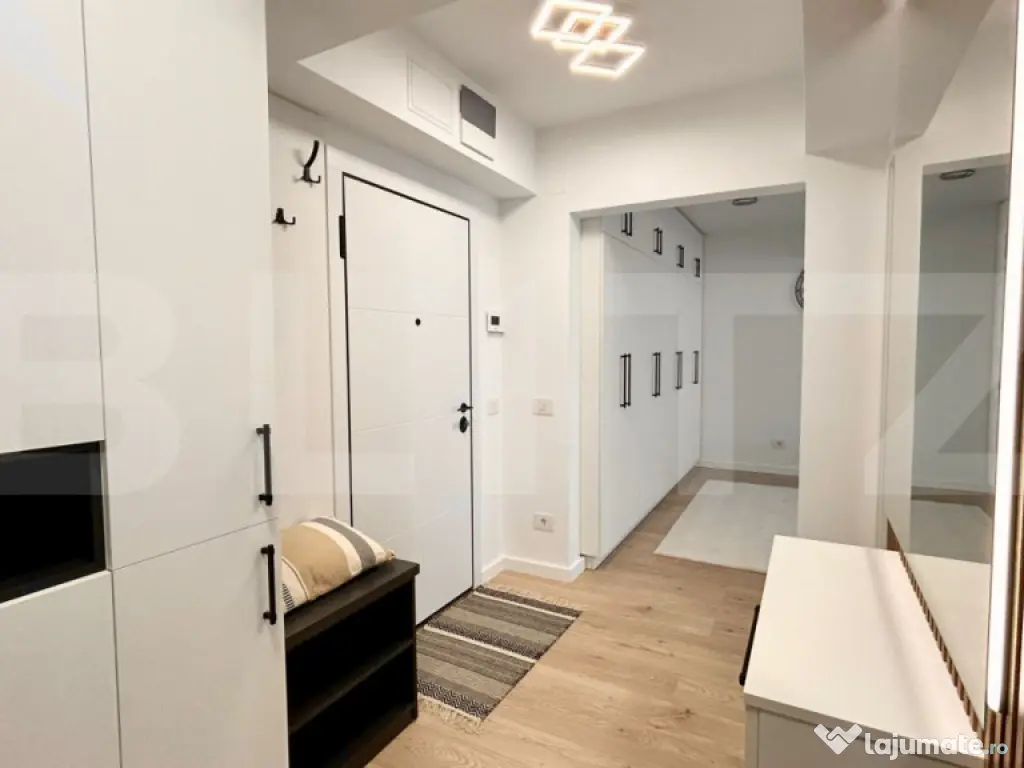 Blitz vă propune spre închiriere un apartament cu 2 camere, situat în complexul rezidențial Prima Green. Proprietatea se află la prima închiriere, fiind situată într-un imobil nou, dotat cu lifturi de ultimă generație. Detalii tehnice: Decomandat. Suprafață utilă: 61 mp. Etaj: 4 din 10. Structură: Dormitor matrimonial, living, bucătărie închisă (separată), baie dotată cu cadă. Apartamentul este complet mobilat și utilat, dispunând de dotări moderne: Sistem de încălzire: Încălzire în pardoseală cu contorizare individuală. Climatizare: Sistem de aer condiționat. Bucătărie: Complet echipată cu plită pe inducție, cuptor electric, hotă, combină frigorifică și mașină de spălat vase. Alte dotări: Televizor Smart și mașină de spălat rufe. Loc de parcare privat inclus în prețul chiriei. Cod ofertă / ID BLITZ: P166948 Id intern: P166948 Confort: 1 Tip imobil: Bloc de apartamente Număr Băi: 1 Nr. locuri parcare: 1