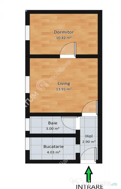 Locuinta are 37 mp utili, acesta este compusa dintr-un hol de acces amenajat cu pantofar si cuier, bucatarie separata, camera de zi si dormitor.