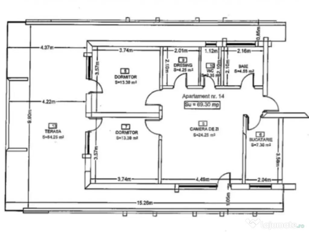 Apartament semidecomandat, bucatarie inchisa, terasa de 64 m