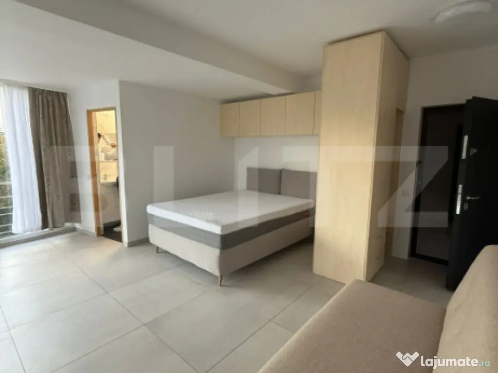 Compartimentare: cameră spațioasă cu zonă de dormit (pat matrimonial) și zonă de zi (canapea), bucătărie open-space, baie elegantă cu duș walk-in, balcon cu vedere deschisă