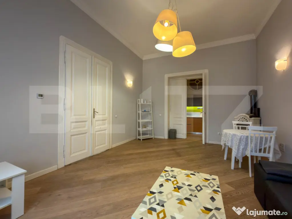 Locuinta are o suprafata de 65 mp, o compartimentare semidecomandata si se remarca prin tavanul inalt, care ofera un plus de spatiu si luminozitate. Este o proprietate excelenta, gandita ca fiind ideala pentru cupluri.