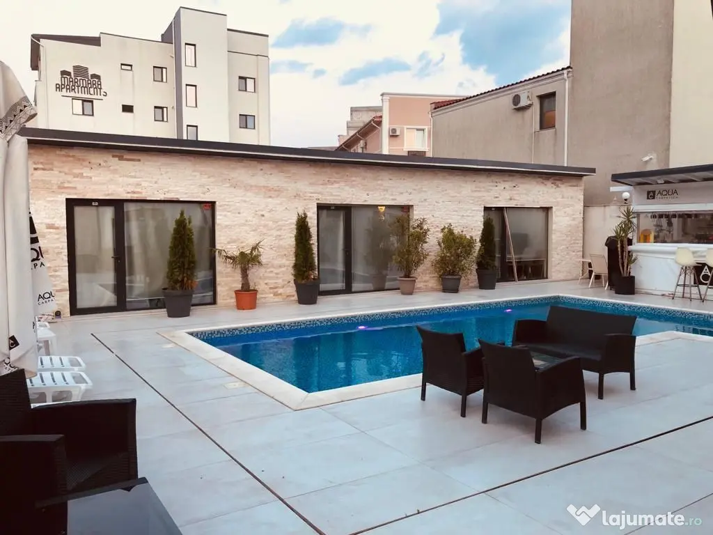 Agentia Acord Imobiliar va propune spre achizitie o pensiude ultramoderna finalizata in 2017. Pensiunea dispune de un teren in suprafata de 590 mp pe care sunt construite 3 bungalowuri , piscina exterioara, 4 apartamente de 2 camere cu suprafete de 80 mp utili plus terase, un apartament cu 4 camere 160 mp plus terasa, un apartament la demisol de 2 camere, camera centralei, barul din fata piscinei o rulota tip fast -food Zona este foarte cautata pentru inchirierea in regim hotelier (clienti formati). Se vinde mobilata si utilata. Afacere cu predare la cheie. Vizionarea ofertei se face in baza acordului de vizionare. Număr niveluri imobil: 2 Număr Băi: mai mult de 3 Posibilitate parcare: Da Nr. locuri parcare: 10-20 Curent Apă Canalizare Gaz Încălzire Climă Demisol