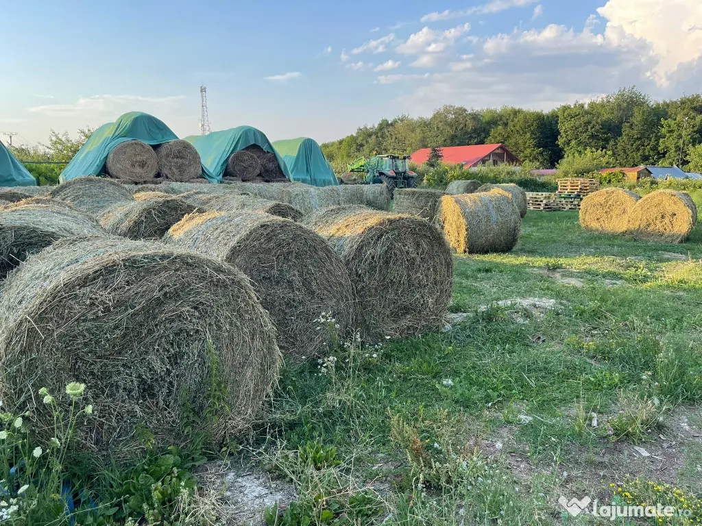 Furaj premium : baloți fan si semifan (înfoliați) din lucerna in agricultură ecologică : 1.Semifan - baloti infoliati de lucerna : Baloții au dimensiunea 1,2 X 1,2 m, presați la 160 bari cu balotieră cu cameră variabilă Claas Variant 360 RotoCut din 2023. Greutate între 350 și 530 kg buc, în funcție de umiditate (40-65% măsurată cu aparat Wille) . Pretul este de 250 lei/buc. 2. Fan uscat de lucerna la 200 lei/buc . Vladeni, Botoșani. Posibilitate transport. Fac și schimb cu viței rase carne Angus, Limousine, Charolaise, Aubrac, Highlander cu acte.