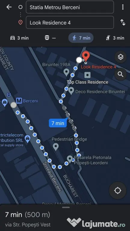 Distanta pana la Metrou Berceni este de 500 metrii - aproximativ 7 minute de mers pe jos - a se vedea ultima poza din Google Maps.