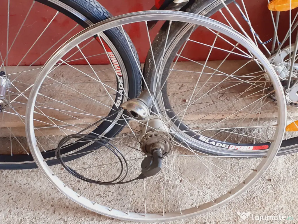 Biciletele sunt funcționabile.Dotate cu dinam fiecare și lumini față spate. Frînele sunt și ele funcționabile.Roțile sunt de 28 inch.Plus o geantă cu tot cu butuc cu 5-7 viteze.E funcționabilă.Dar trebuie remediată o mică defecțiune.Se poate remedia prin schimbarea piesei. Prețul este pentru cele 2 bicilete plus acea geantă cu viteze. www.youtube.com/watch?v=hF4HE0msj2I www.youtube.com/watch?v=FcnlorGDiAY