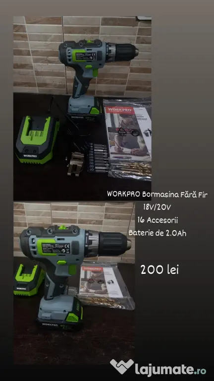 Bormasina fără fir Workpro 18/20 v,16 accesorii, baterie de 2.0 ah,cutie desfacuta pentru verificare