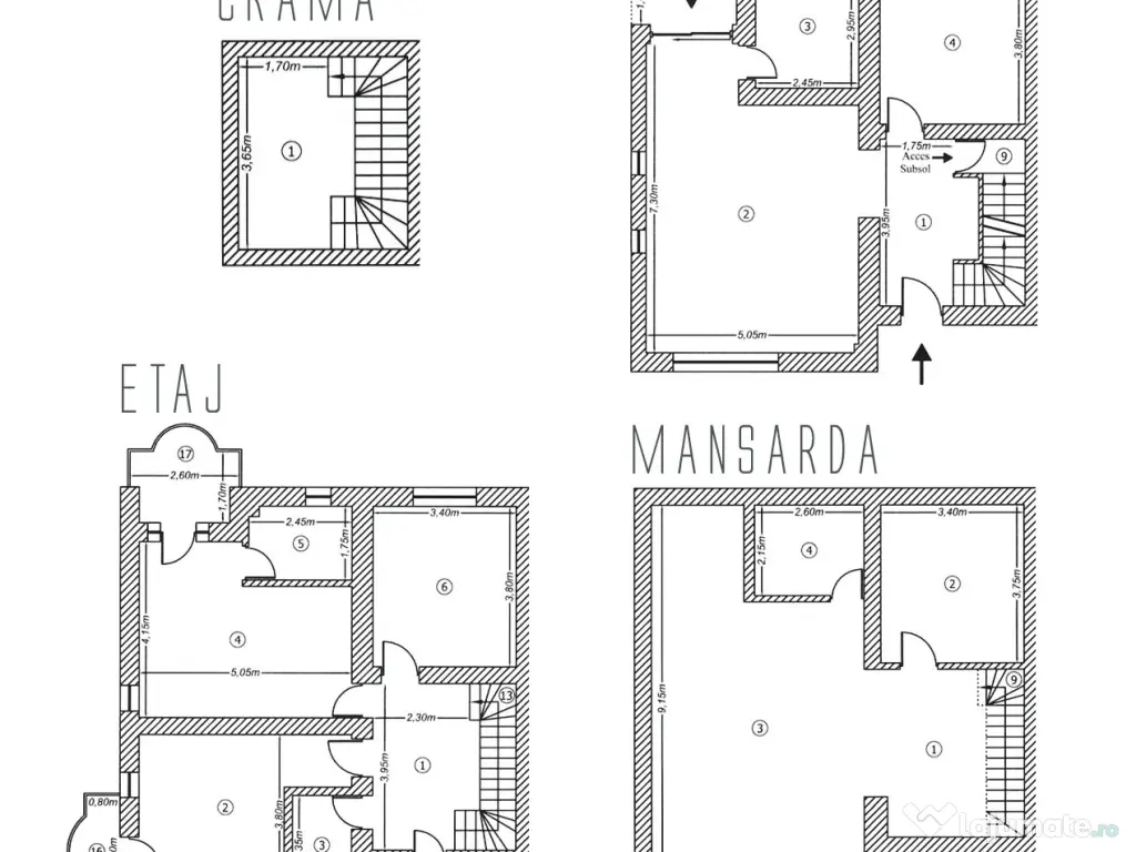 • Etaj 1 – 3 dormitoare (dormitor matrimonial cu baie și balcon, dormitor cu balcon, dormitor suplimentar + baie), hol cu balcon
