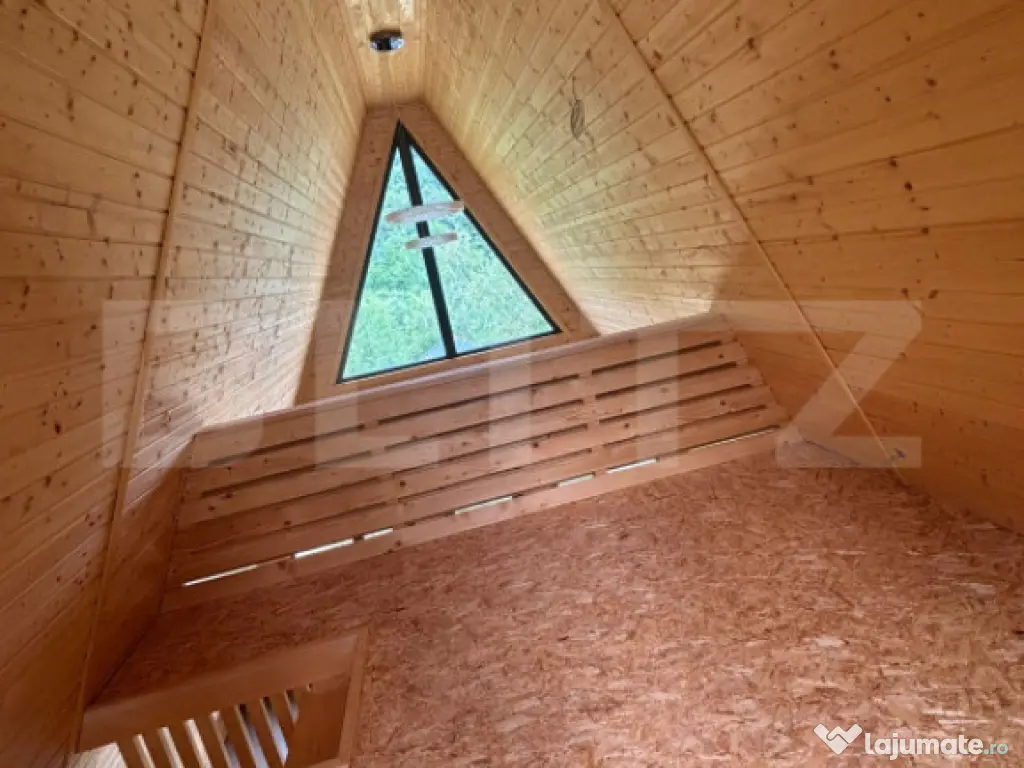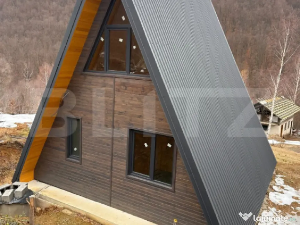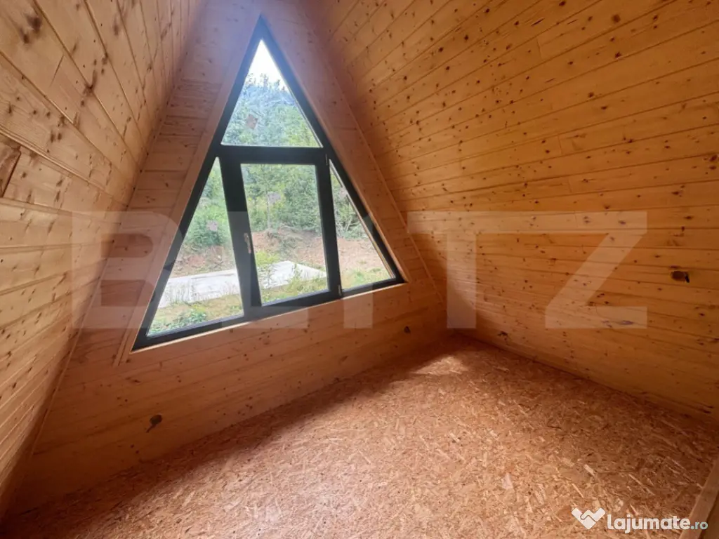 Blitz va propune spre achizitie o casa tip A frame, amplasata pe 560 mp de teren. Imobilul are suprafata de 55.80mp, compartimentat astfel Parter: living, camera, baie Pod: camera, hol Situat intr o zona linistita, ideal pentru relaxare, sau inchirierea in regim hotelier. Cod ofertă / ID BLITZ: P150002 Id intern: P150002 Număr Băi: 2 Curent Apă
