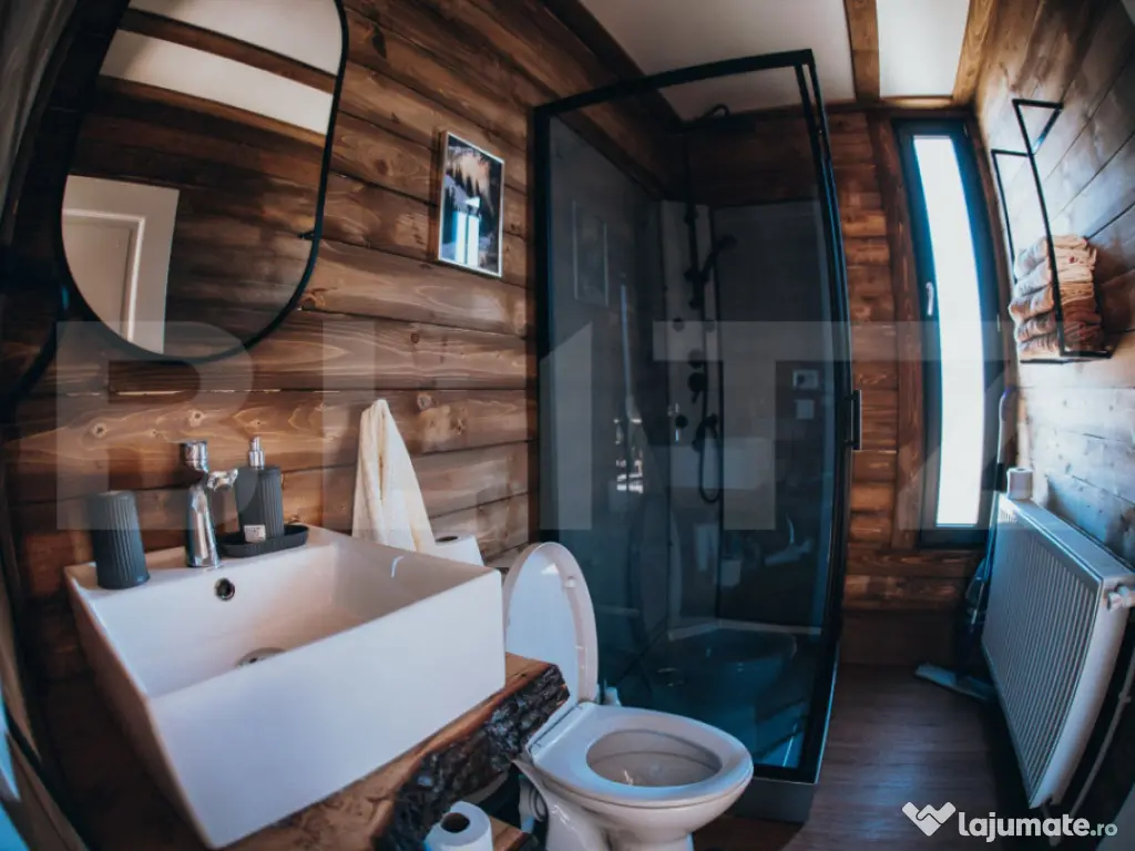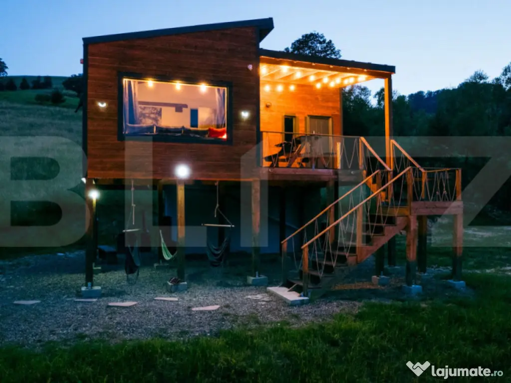 Blitz Imobiliare vă propune o proprietate rară, pentru cei care caută liniște, libertate și valoare autentică. În inima Bucovinei, într-o zonă extrem de retrasă și liniștită, în satul Demacusa – comuna Moldovița, se află această cabană tip tiny house, un adevărat colț de rai, unde natura, confortul modern și potențialul investițional se îmbină perfect. Construcție din lemn, tablă tip click și lambriu, complet mobilată și echipată, gândită pentru locuire permanentă sau turism premium. Compartimentare ideală: • 2 dormitoare primitoare • Living open-space cu bucătărie – locul perfect pentru seri calde la șemineu • 1 baie modernă • Cameră tehnică la sol, zidită din BCA, cu placă de beton conform normelor Confort și autonomie totală: • Centrală pe peleți Fornello 25 kW • Șemineu (fireplace) pentru atmosferă și căldură • Izolație premium: vată minerală 15 cm + folie barieră vapori • Instalație electrică realizată cu cablu cu protecție metalică • Racordată la rețeaua electrică • Internet prin satelit Starlink – ideal pentru work from nature Resurse naturale rare: • Râu la baza terenului, cu acces direct • Izvor captat • Teren generos de 2 hectare intravilan Relaxare & experiență: • Ciubăr cu hidromasaj pe GPL, pentru 6 persoane • Grătar zidit cu sobă și plită – pentru seri memorabile • Anexă/fânar din lemn pentru depozitare Pe teren se află și o căsuță veche din lemn, cu un potențial extraordinar de a fi transformată într-o casă tradițională bucovineană – ideală pentru extinderea afacerii turistice. Potențial excelent de business Proprietatea este perfectă pentru: • turism de tip retreat / glamping • închiriere în regim hotelier • casă de vacanță exclusivistă • refugiu off-grid cu toate facilitățile moderne Localizare: zonă izolată, fără vecini apropiați, liniște deplină, aer curat și priveliști autentice – un loc unde timpul încetinește. Contactează Blitz Imobiliare pentru mai multe detalii și pentru a programa o vizionare. Aceasta nu este doar o proprietate. Este un stil de viață. Cod ofertă / ID BLITZ: P161421 Id intern: P161421 Stadiu construcţie: Finalizat Număr încăperi: 3
