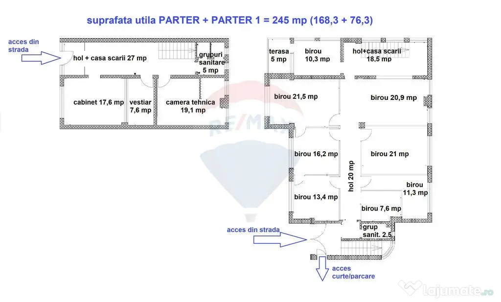 Acest pachet de închiriere cuprinde Parterul și Parterul 1, totalizând o suprafață utilă de 245 mp, eficient compartimentată în 9 camere, 2 grupuri sanitare, hol, casa scării și vestiar.