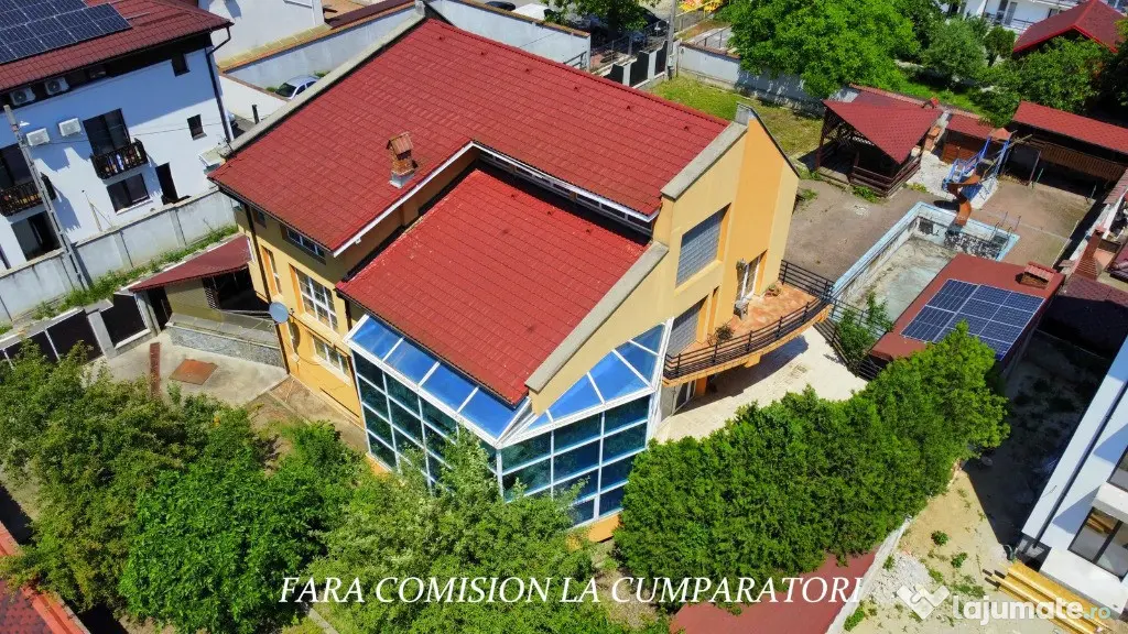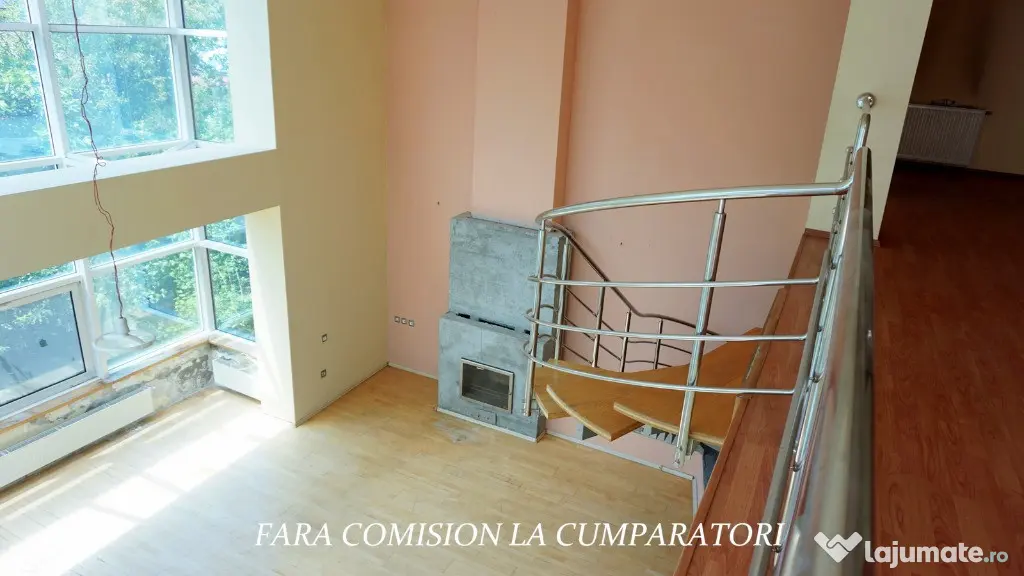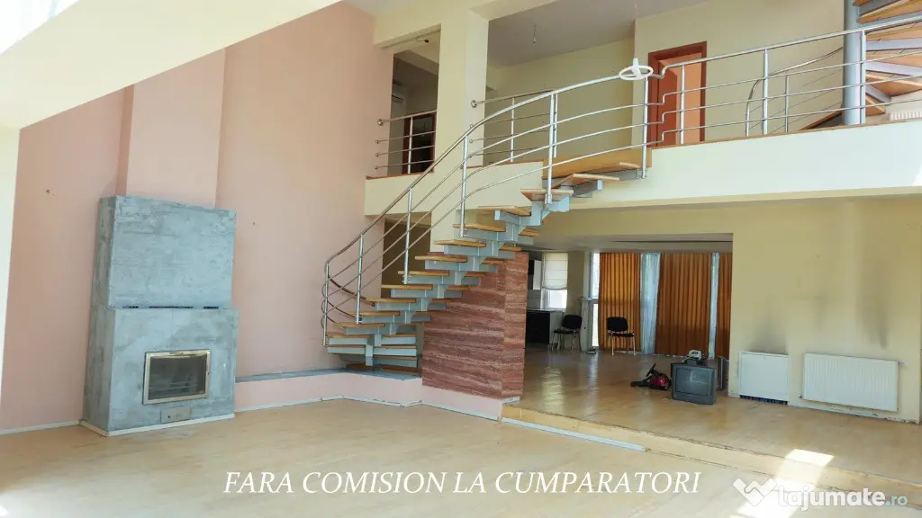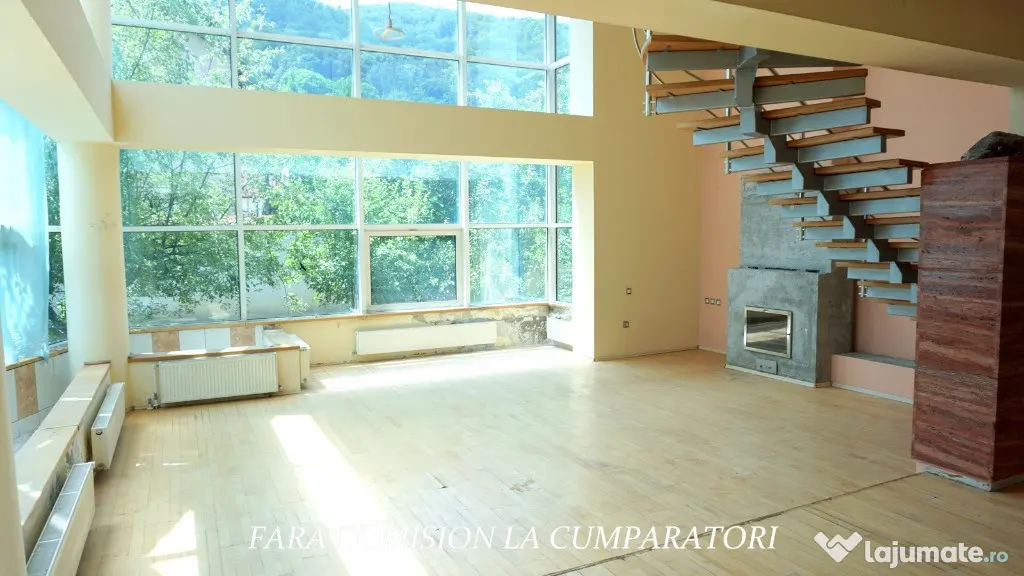 Parterul este spectaculos, cu un salon de 100 mp, pe jumatate deschis pe verticala si pe nivelul etajului, cu rupere de nivel si un frumos semineu, un spatiu excelent pentru un restaurant, profitand si de o terasa suplimentara de 53 mp ce face legatura cu exteriorul. Tot la parter este o bucatarie generoasa, un birou si o baie