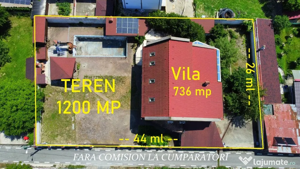 Terenul are o suprafata de 1200 mp, este perfect plan, proportii excelente (44/ 26 ml) cu suficient loc pentru parcare, terasa, piscina, eventual loc de joaca si amenajare peisagistica.