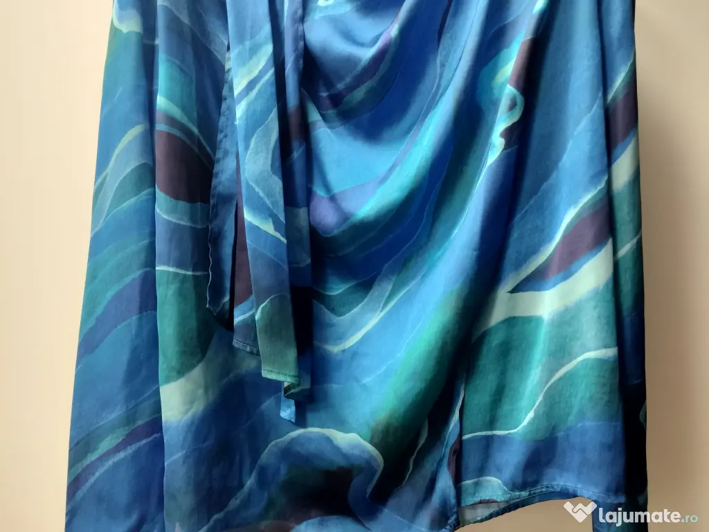 Cămașă satinata, croi modern cu o prelungire din umăr, care poate avea rol de eșarfă, multicolora, predominant fiind albastru, mânecă lungă, mărimea M/L