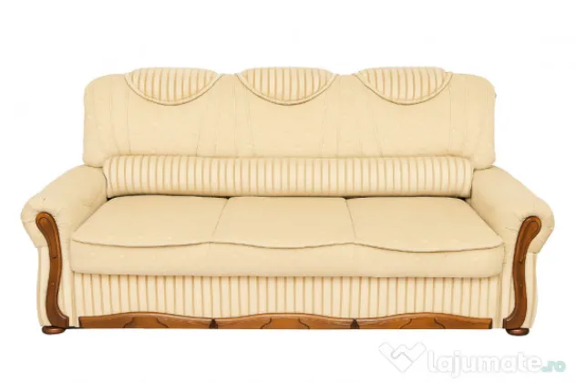 Vând canapea spațioasă, 3 locuri, într-o nuanță plăcută de crem, cu tapițerie rezistentă și model discret. Are detalii frumoase din lemn masiv închis, vizibile la picioare și la brațe, ceea ce îi dă un aer elegant, potrivit pentru un living generos sau o cameră de oaspeți.