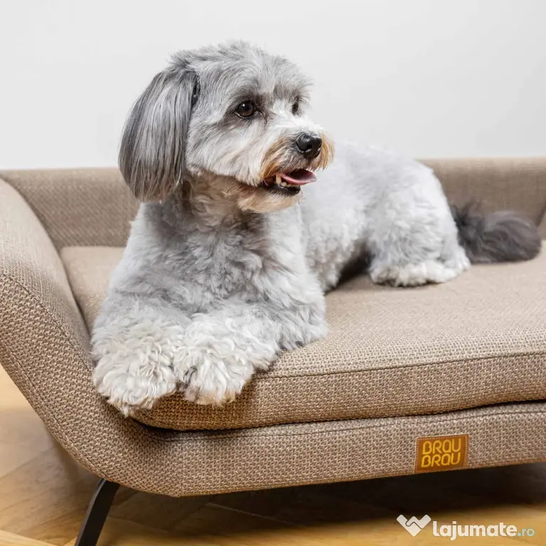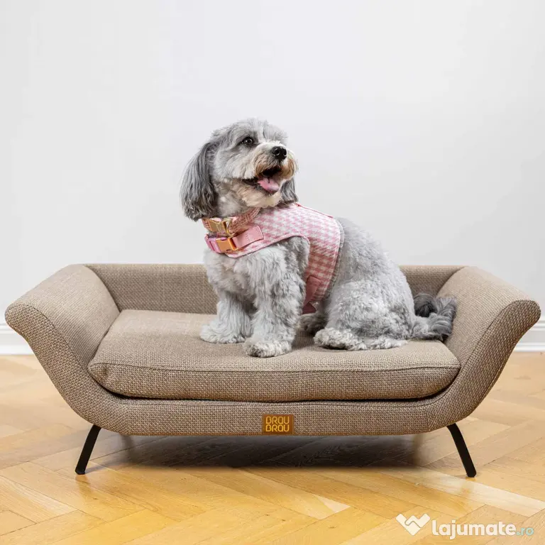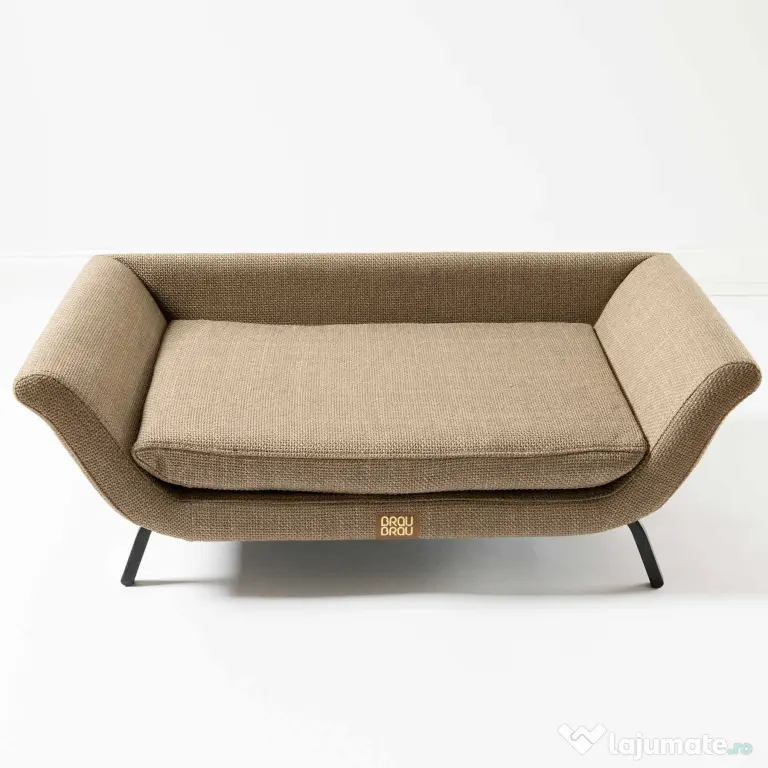 Aceasta aduce un aer nostalgic și elegant, inspirat din formele clasice de mobilier, fiind perfectă pentru câini sau pisici care adoră să se relaxeze cu stil. Structura este bine proporționată, cu linii drepte și brațe laterale înclinate, oferind susținere, iar picioarele metalice de culoare neagră conferă stabilitate și completează aspectul retro al patului.