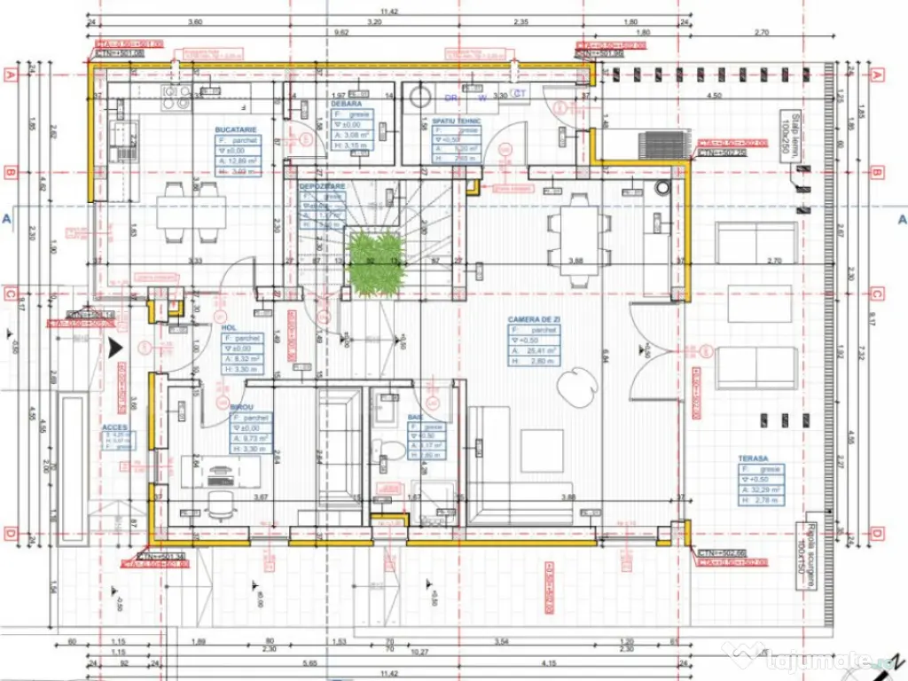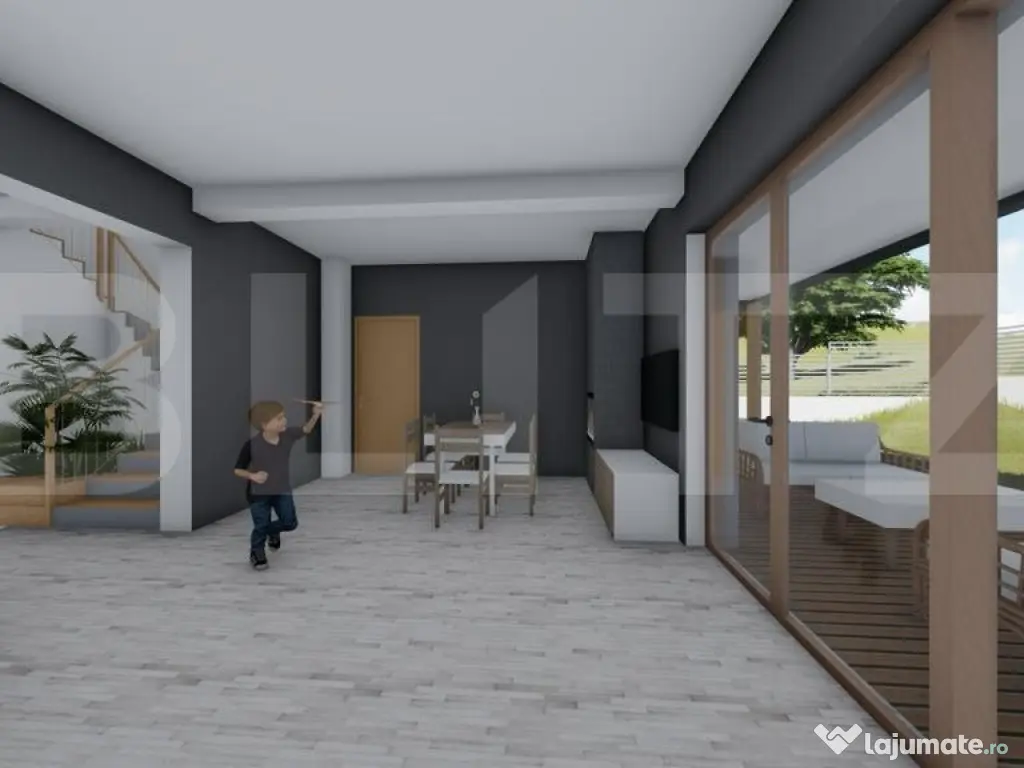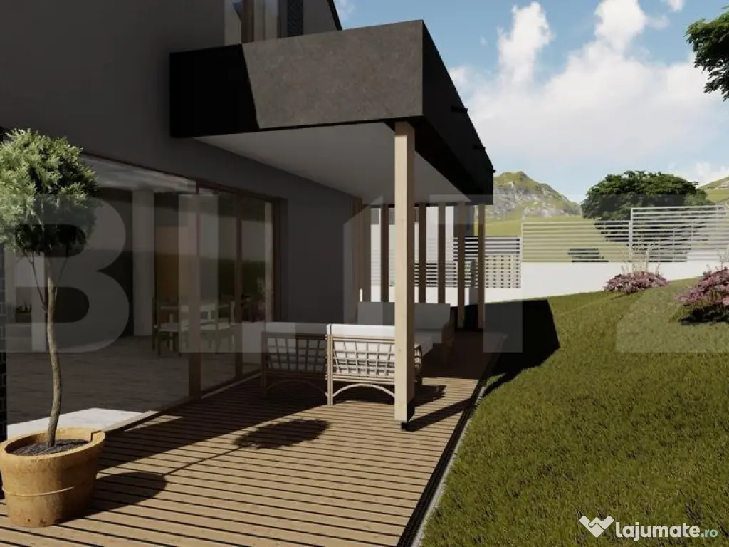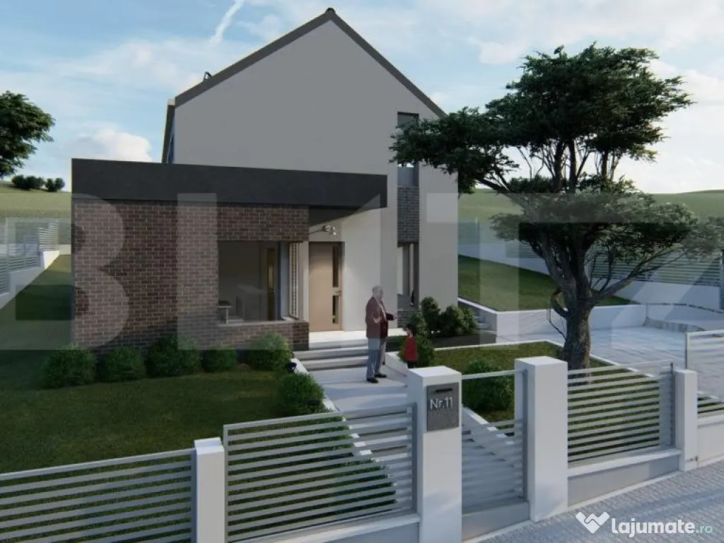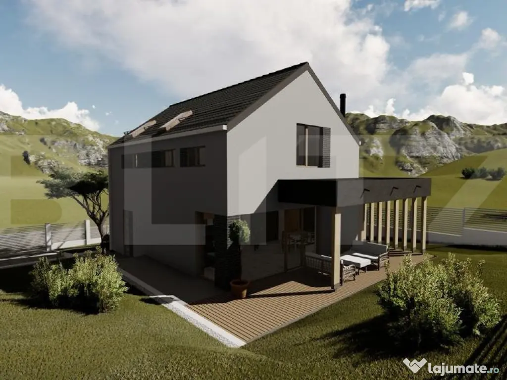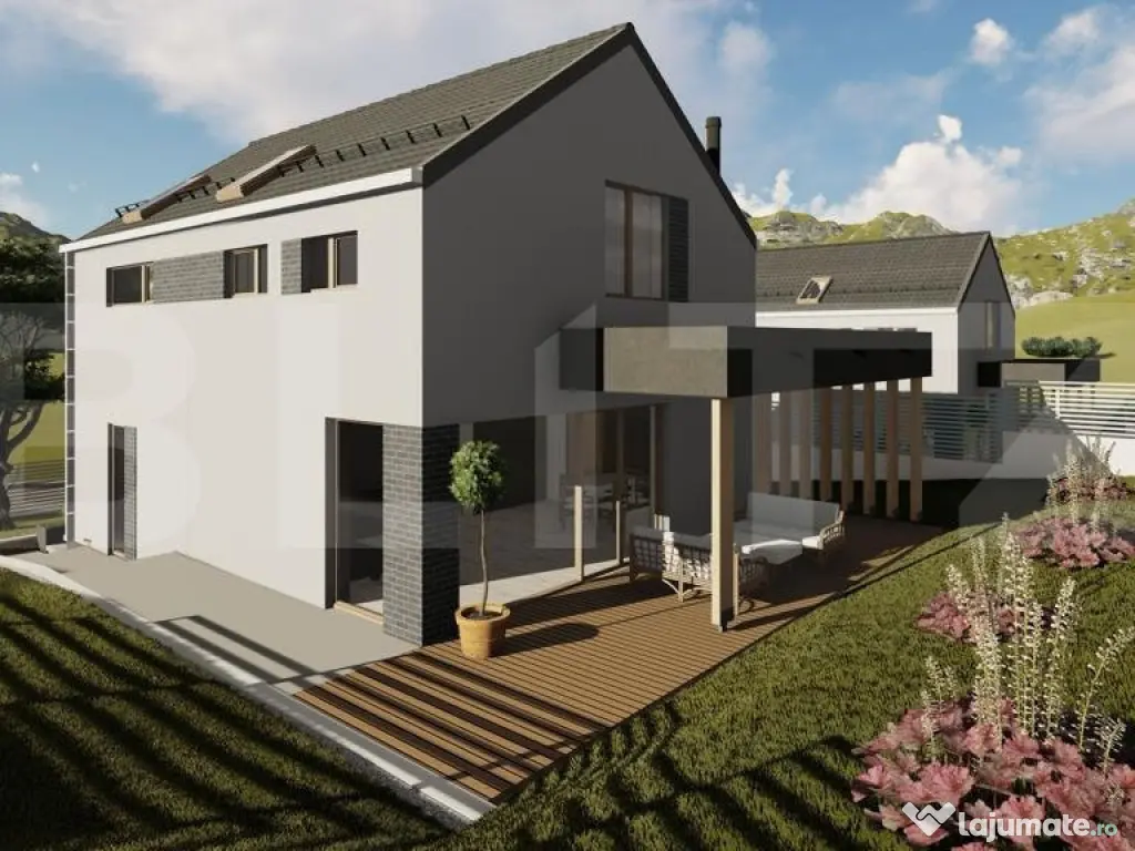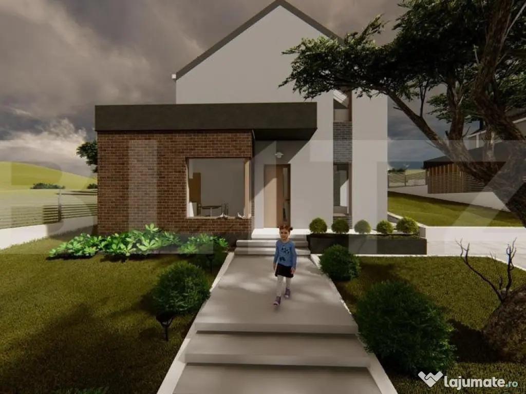 Blitz propune spre vânzare o casă cu design contemporan, aflată la intrare în Chinteni, în zona Profi – o locație liniștită și în plină dezvoltare, la doar câteva minute de Cluj-Napoca. Construită pe un teren de 500 mp, proprietatea impresionează prin arhitectura modernă și compartimentarea inteligentă, având o suprafață utilă de 125 mp: Parterul include: Hol generos la intrare Bucătărie spațioasă cu cămară separată Baie de serviciu Living luminos cu acces direct către o terasă de 32 mp Birou ideal pentru lucrul de acasă Spațiu tehnic Mansarda este dedicată zonei de noapte și oferă: Dormitor matrimonial cu dressing și baie proprie Două dormitoare secundare Baie spațioasă de 6.5 mp Casa va fi construită din cărămidă, cu acoperiș din țiglă ceramică, și se va preda la stadiul de semifinisat, ceea ce îți oferă libertatea de a o personaliza după propriul gust. Dotări tehnice moderne: Racordare la apă, curent și canalizare Încălzire prin pardoseală alimentată de pompă de căldură – soluție eficientă și sustenabilă Termen estimat de finalizare: Aprilie 2026 Aceasta este o oportunitate excelentă pentru cei care caută o locuință modernă, bine gândită, într-o zonă aerisită, dar foarte accesibilă față de oraș. Contactează-ne pentru mai multe informații sau pentru a rezerva această casă înainte să fie finalizată! Cod ofertă / ID BLITZ: P147141 Id intern: P147141 Număr niveluri imobil: 1 Număr Băi: 3 Nr. locuri parcare: 2 Curent Apă Canalizare