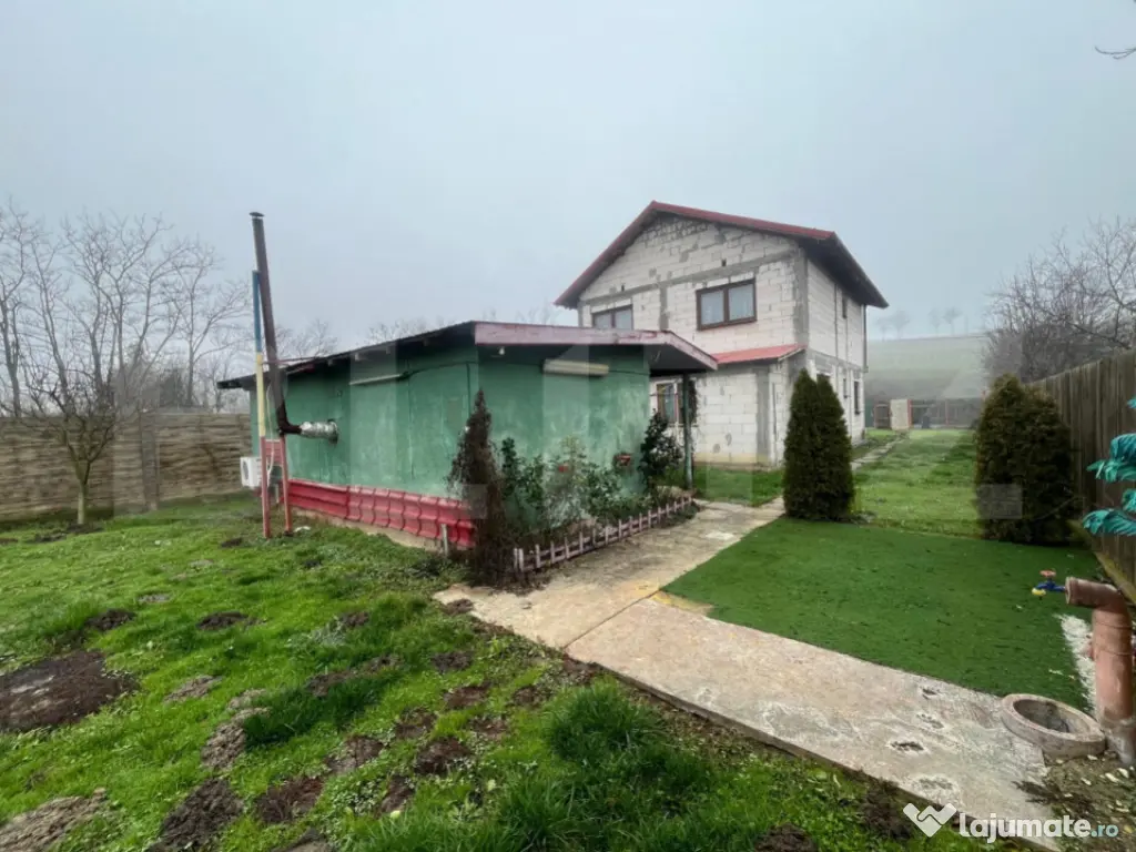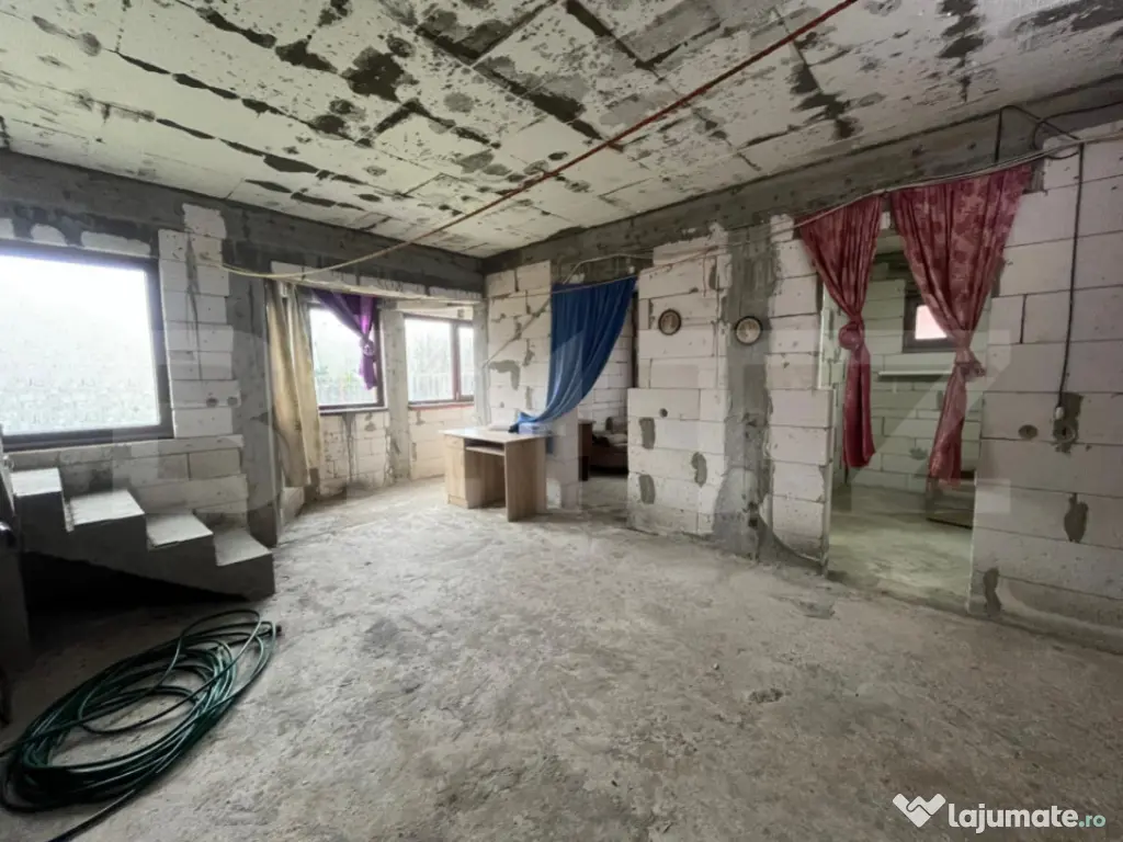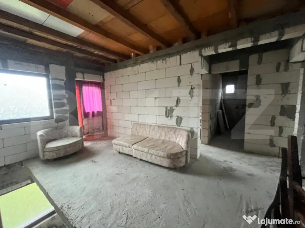 Blitz va propune spre achizitie o proprietate al carei teren masoara 811 mp si are un front stradal de 14,3 ml, pe care regasim o casa P+1, nefinalizata, solida, construita in anul 2015 pentru uz propriu, din BCA, avand structura de beton, acoperis din tabla si geamnuri termopan. Casa are o amprenta la sol de aproximativ 80 mp, la parter avand living, doua dormitoare, bucatarie si baie, in timp ce la etaj regasim 3 dormitoare, un hol foarte spatios de unde se face accesul pe balcon si o baie. In plus exista o anexa locuibila cu doua camere mici si o baie. Proprietatea beneficiaza de curent trifazic si apa de la put, avand apa de la retea disponibila la fornt. Curtea este imprejmuita si amenajata cu gazon, pomi si flori. Zona este una foarte linistita, frumoasa si verde. Pentru si mai multe detalii, nu ezitati sa ne contactati! Cod ofertă / ID BLITZ: P161033 Id intern: P161033 Număr Băi: 2 Curent Apă