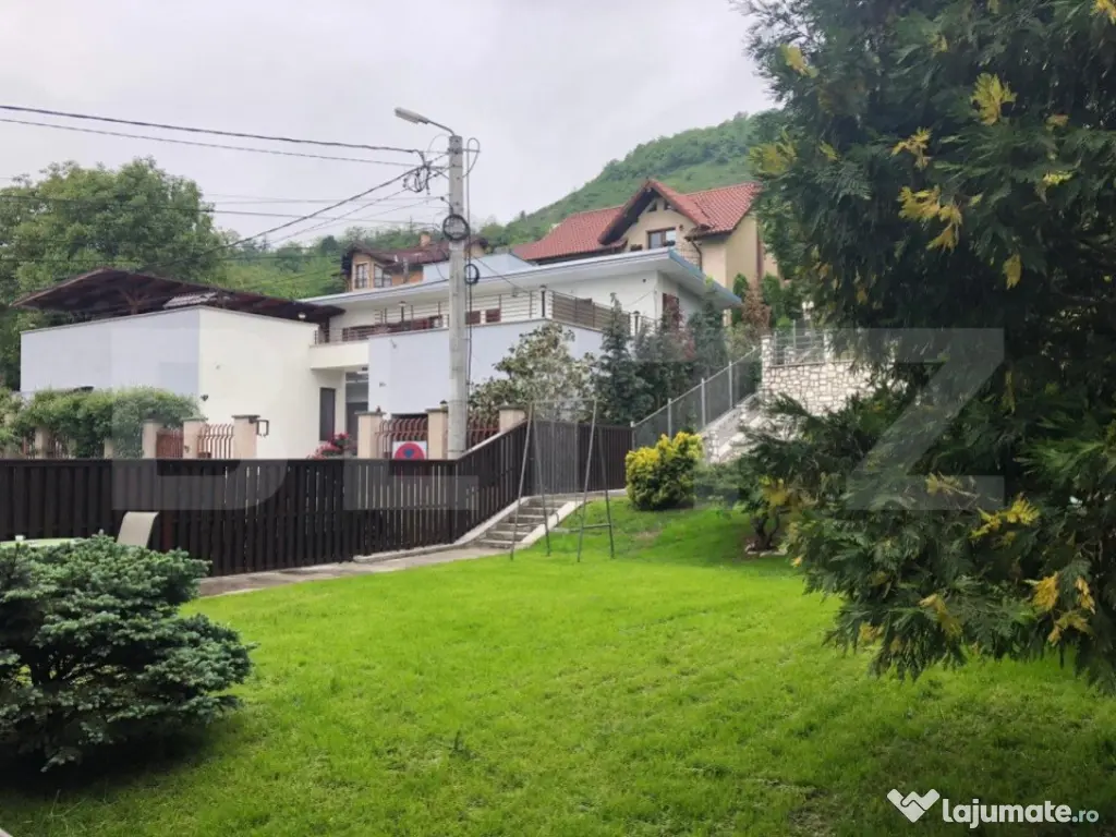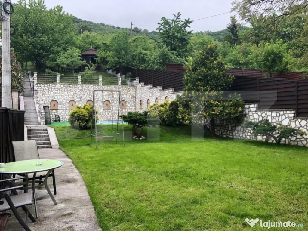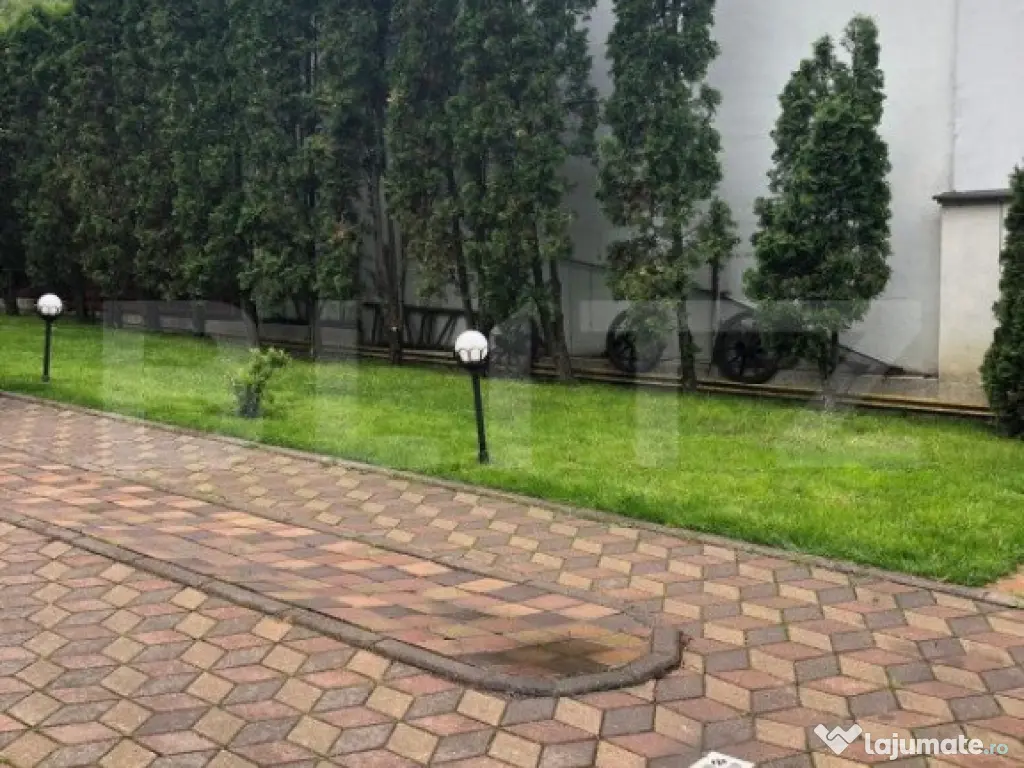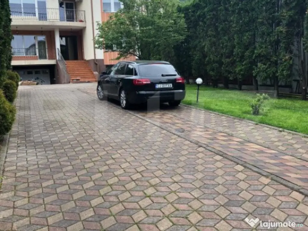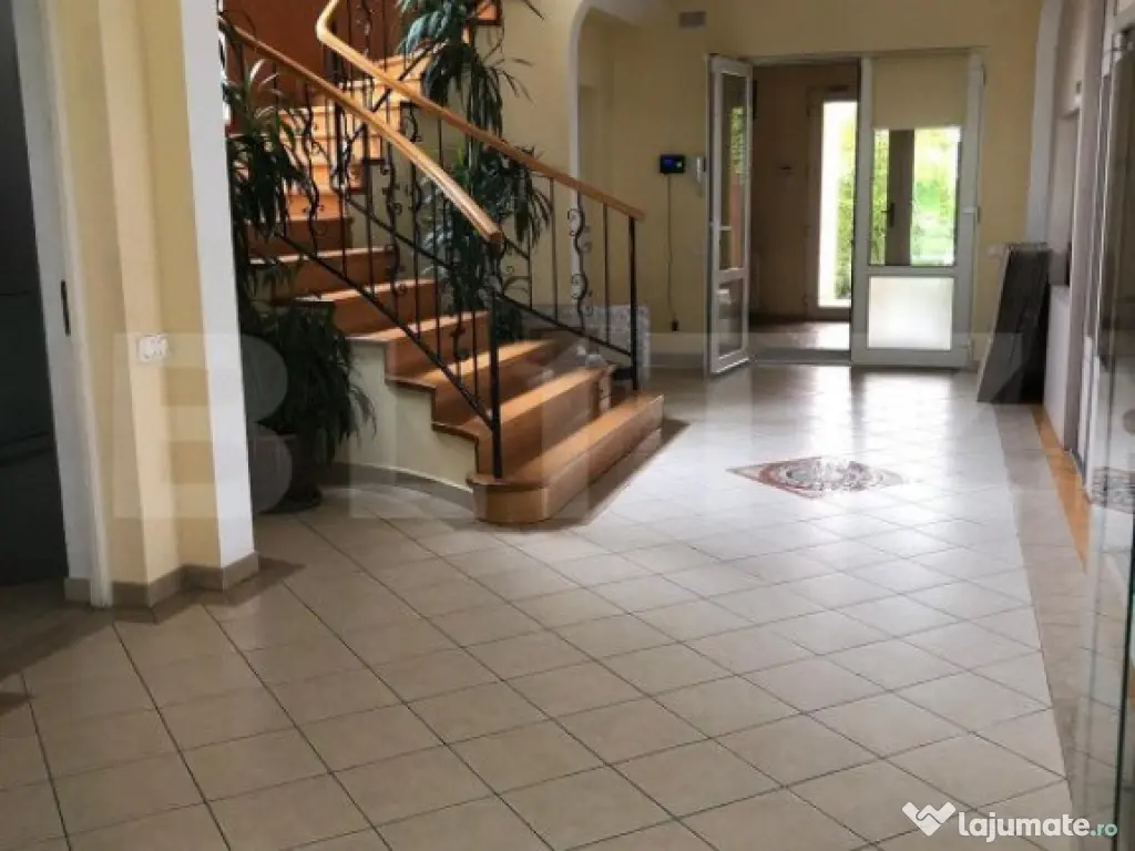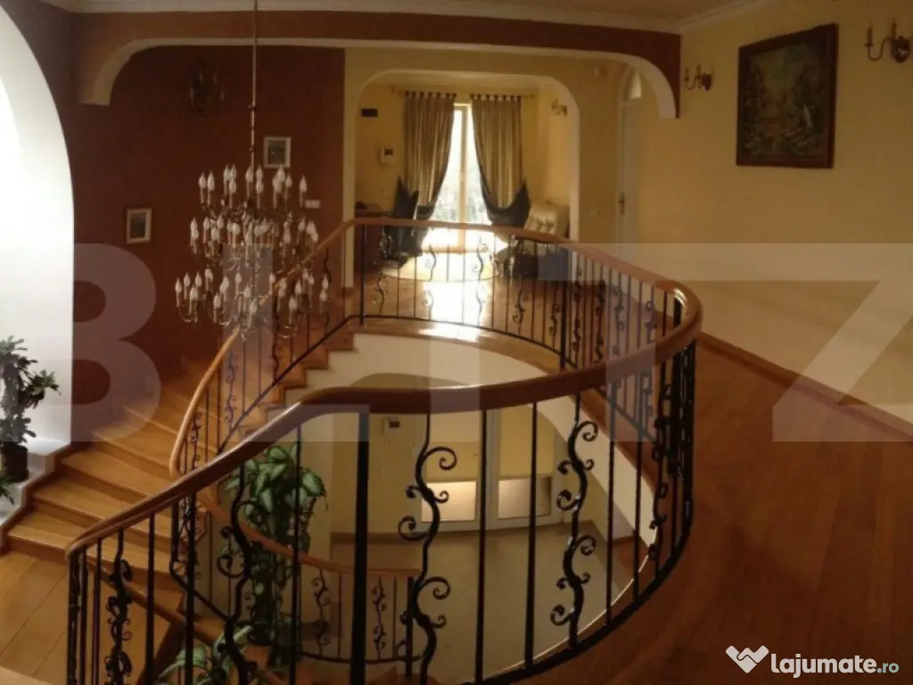 Blitz va propune spre inchiriere, o casa exclusivista cu suprafata generoasa intr-o zona de case si vile. Desi proprietatea ofere intimitate si acces usor, este aproape de toate facilitatile unui trai cotidian. In proximitate de banci, magazine, cafenele, farmacii, scoli. Un imobil pretabil pentru o familie numeroasa, sau un sediu impresionant de firma! Cu o suprafata utila de 720 mp, imobilul este construit in 2002, si are urmatoarea configuratie: D+P+E+M. La demisol se afla un garaj pentru minim 3 masini, o baie, 2 spatii de depozitare, camera termica, o sala de hobby. Cu acces din demisol, gasim si un apartament cu un dormitor, living open space cu bucatarie si baie. Parterul este compus din: Bucatarie modern mobilata si utilata, cu acces la terasa din spate si camara de alimente, camera de zi, loc de servit masa si o biblioteca, care da intr-un hol impunator de unde pornesc scarile interioare din lemn masiv care fac parte integrata din peisajul interior al casei. De asemenea mai gasim baie, sera de plante, acces la scarile secundare cu intrare spre demisol. Terasa in fata casei, cat si in spatele imobilului. Etajul are 6 dormitoare, 4 bai, 2 terase si un hol. Mansarda este configurata intr-un open space cu acces la 2 birouri decomandate, o baie si o mini bucatarie. Casa dispune de izolatie exterioara, finisaje de foarta buna calitate, si cu foarte mult bun gust. Un spatiu generos care poate fi recompartimentat in functie de nevoile si dorintele viitorului proprietar. Curte, de 2000 mp, compusa din 3 zone; partea din fata, cu aleea de acces spre casa, cu zona de flori, pavaje si arbusti decorativi; partea de recreere din spatele imobilului, unde gasim o piscina cu sistem de filtrare al apei, in perfecta stare de functionare, spatiul de relaxare, sezlonguri, gazon cu sistem de irigare, aleei pavate. Aceasta parte a curtii duce spre zona de livada, unde se gaseste un foisor, cu BBQ, plin de pomi fructiferi cu multa verdeata pentru un picnic in intimitatea si discretia caminului. Sistemul de alarma confera siguranta iar automatizarile portilor si a garajului duc la un confort sporit. Cod ofertă / ID BLITZ: P122726 Id intern: P122726 Număr niveluri imobil: 2 Număr Băi: 8 Nr. locuri parcare: 5-10