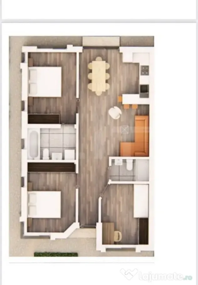 Configurație: 3 camere, 2 băi, bucătărie open space cu living.