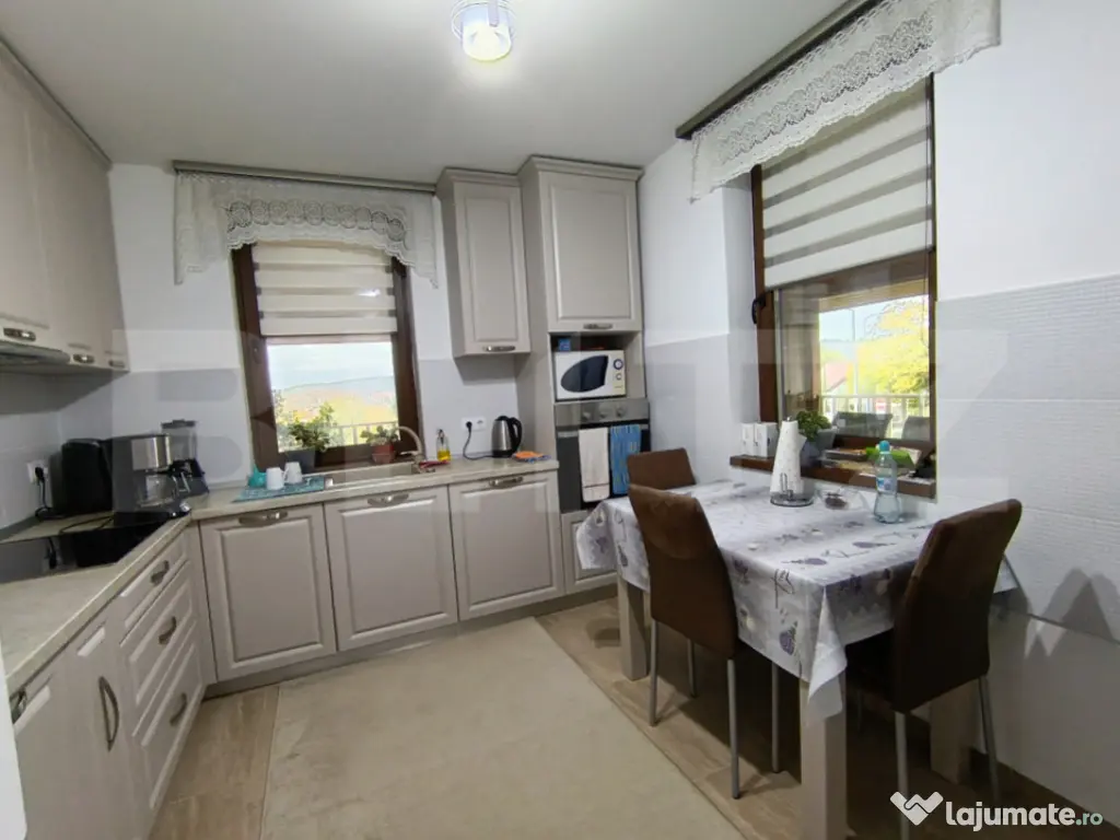 Blitz va prezinta o casă nouă, modernă și elegantă, situată într-o zonă aerisită și liniștită din apropierea , cu o priveliște superbă spre pădure și oras. Construită cu materiale premium, această locuință oferă un mix ideal de confort, stil și intimitate Situată într-o zonă retrasă și liniștită, aproape de oras, ideală pentru cei care caută confort și intimitate. Proprietatea beneficiază de o panoramă deosebită și finisaje de înaltă calitate, realizate cu materiale premium. Suprafață: 122 m² Teren: 500 m² Construită în 2020, cu finisaje de calitate superioară Zonă premium, priveliște deosebită, fără aglomerația orașului Acces rapid și facilități moderne Ideală pentru familie sau pentru sedii firme, activități de birou. Compartimentare eficientă: Parter : hol, living de 30 mp modern mobilat, bucătărie complet echipată , cămară funcțională și spațiu tehnic sub scări închis. 3 camere , baie cu geam și 1 balcoane Pod : spațiu depozitare cca 40 mp Dotări premium: Incălzire în pardoseală cu automatizare pe 4 zone, aer condiționat, trepte și elemente din stejar masiv, glafuri marmură, uși Porta Facilități exterioare: 2 locuri de parcare 1 garaj cu o baie și un spațiu de depozitare și un beci poartă autoportantă automatizată și gard . Conectivitate: gaz, apă, curent, fibră optică Proprietatea este perfectă pentru cei care își doresc un cămin modern, elegant și bine compartimentat, într-o locație liniștită, cu peisaje naturale spectaculoase! Proprietatea poate fi transformată și în sediu de firme pentru diverse afaceri. Documentația foto pentru toate etapele construcției atestă calitatea ireproșabilă a lucrărilor. Prețul reflectă calitatea și avantajele oferite. Contactează-mă pentru detalii și vizionări Cod ofertă / ID BLITZ: P154824 Id intern: P154824 Număr Băi: 2 Nr. locuri parcare: 3 Curent Apă Canalizare Gaz Sistem irigaţie