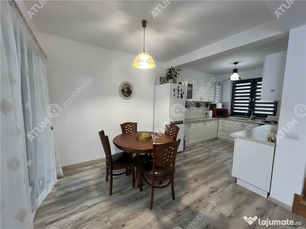 Casa mobilata si utilata de vanzare in Selimbar cu suprafata totala de 120 mp, compusa din Parter Etaj Pod, construita pe un teren de 100 mp si situata in zona Triajului din Selimbar. Interiorul casei are o suprafata utila de 93 mp, fiind impartita pe parter si etaj. Parterul este compus dintr-o camera de zi generoasa care este tip open space cu o bucatarie incapatoare dar care prezinta o posibilitate reala de a se putea delimita cele doua incaperi, baia de la parter dotata cu geam de aerisire si dus si un hol de acces dotat cu pantofar si cuier. Etajul este alcatuit din cele 3 dormitoare, dintre care dormitorul matrimonial dispune de acces intr-un balcon iar celelalte doua dormitoare destinate copiilor sau oaspetilor, o baie dotata cu cada si geam de aerisire si un hol prin intermediul caruia se face accesul in toate incaperile cat si in podul casei prin intermediul unei scari retractabile. Separat de suprafata utila casa dispune de un balcon de aproximativ 3 mp in care se face accesul din dormitorul matrimonial, podul destinat depozitarii care se desfasoara pe toata suprafata casei si o terasa de 8,25 mp care este inchisa in tamplarie PVC in care accesul se face din camera de zi. Parcarea se realizeaza pe cele 2 locuri de parcare proprii delimitate si inscriptionate. Casa este construita cu zidarie din caramida cu grosimea de 30 cm exterior si 25 cm interior, zidarie dubla intre casa ( 70 cm grosime), izolatie termic exterior cu polistiren expandat si zugravita cu tencuiala decorativa. Tamplaria folosita este tip PVC 5 camere marca Salamander cu 3 foi de sticla si protectie solara, glafuri interioare si exterioare, usa de acces marca Q-Fort cu izolatie termica si fonica. Acoperisul este tip sarpanta cu invelitoare tip tigla din beton marca Bramac ce include tot sistemul de la Bramac ( tigla, hidroizolatie, jgeaburi, burlane si parazapezi ). La interior locuinta este finisata modern si dispune de dotari precum incalzire in pardoseala parter/etaj cu distribuitoare separate pentru fiecare nivel, centrala termica pe gaz in condensatie, usi de interior din lemn, scarile prin intermediul carora se ajunge la etaj sunt placate cu lemn masiv din stejar, parchet laminat de 10 mm grosime, pereti tencuiti ( tencuiala var-ciment ), gletuiti si zugraviti in lavabila alba, instalatii electrice cu tablou general individual si sigurante pentru consumatorii de putere, prize si intrerupatoare marca Schneider. Casa se preda complet mobilata si utila cu mobilier de bucatarie din MDF realizat pe comanda cu electrocanice incorporate ( plita pe gaz, cuptor electric, hota si frigider ), camera de zi frumos amenajata cu canapea si mobilier cu multiple spatii de depozitare, doua dormitoare complet amenajate, baile echipate cu obiecte sanitare si mobilierul specific. Valoarea de achizitie este de 200.000 euro negociabil, aceasta poate fi achizitionata si prin accesarea unui credit bancar. ID intern: 3410. Număr Băi: 2 Posibilitate parcare: Da Nr. locuri parcare: 2 Curent Apă Canalizare Gaz