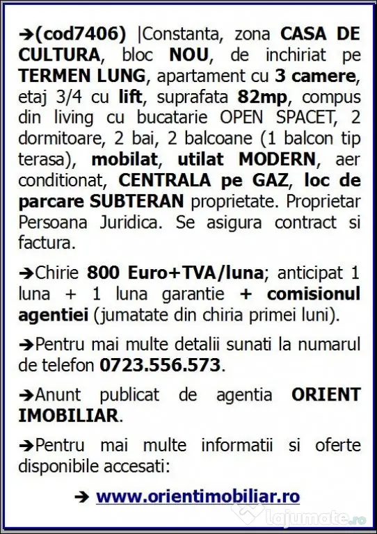 (cod7406) | Constanta, zona CASA DE CULTURA, bloc NOU, de inchiriat pe TERMEN LUNG, apartament cu 3 camere, etaj 3/4 cu lift, suprafata 82mp, compus din living cu bucatarie OPEN SPACE, 2 dormitoare, 2 bai, 2 balcoane (1 balcon tip terasa), mobilat, utilat MODERN, aer conditionat, CENTRALA pe GAZ, loc de parcare SUBTERAN proprietate. Proprietar Persoana Juridica. Se asigura contract si factura.