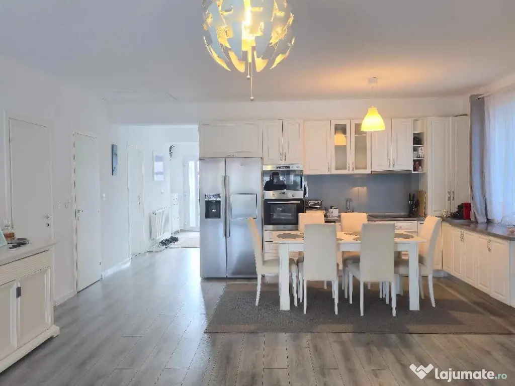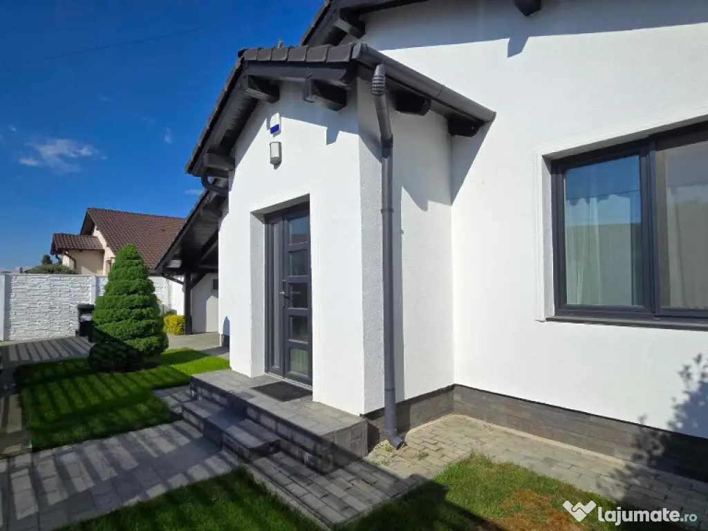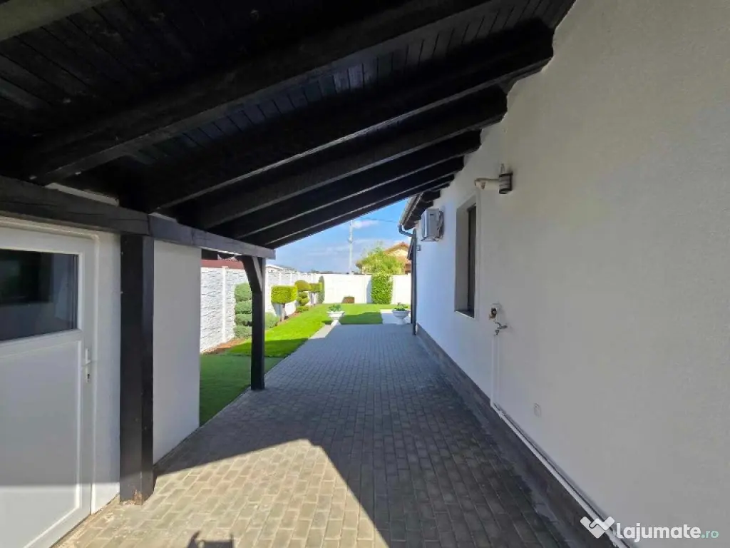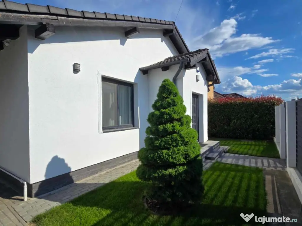 Curtea casei este frumos amenajata, corpuri de iluminat in curte, pavaj de cea mai buna calitate, o terasa si un colt special de relaxare, fantana proprie pentru irigatie, utlitati complete: apa, canalizare, gaz. Compartimentarea casei este practica, fiecare mp a fost folosit inteligent, iar decoratiunile au fost bine gandite, fiind in deplina armonie cu ambientul casei si cu designul acesteia.