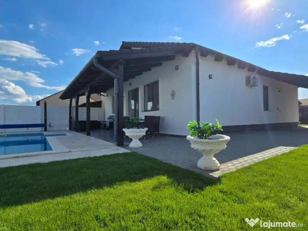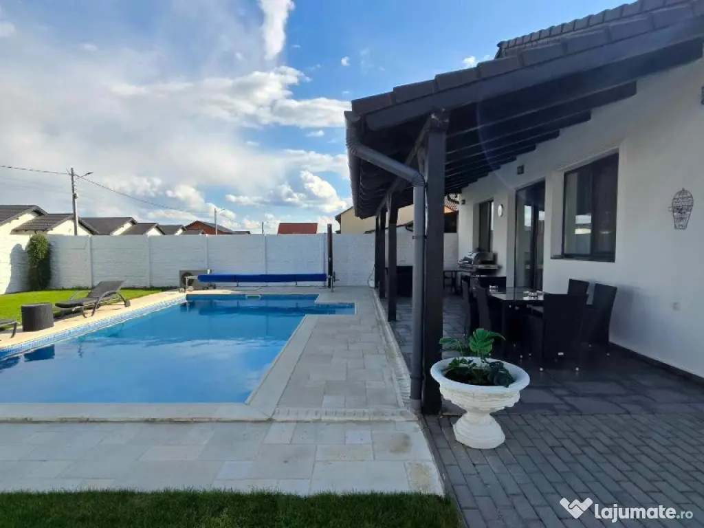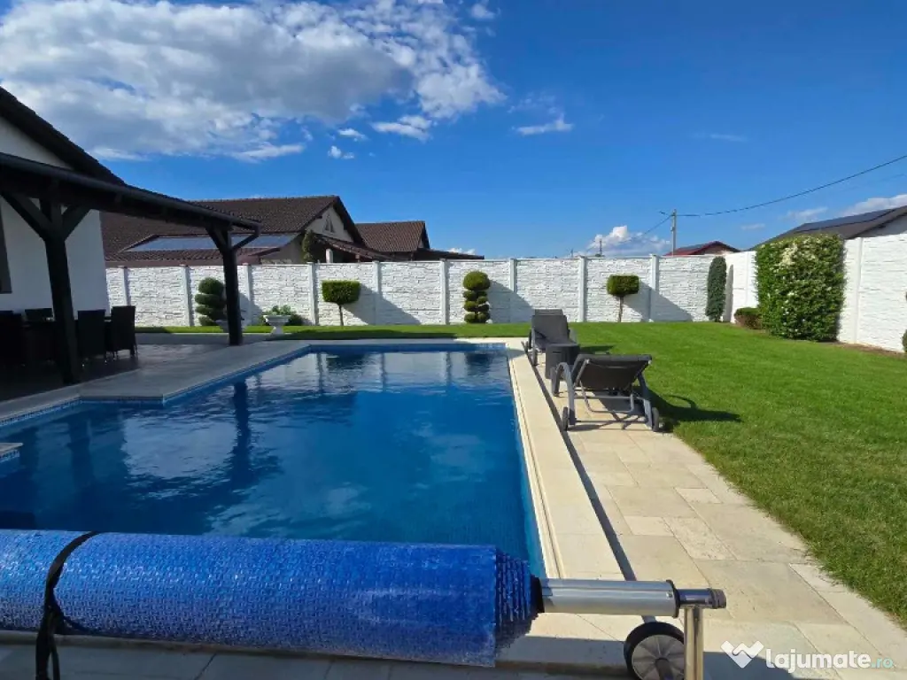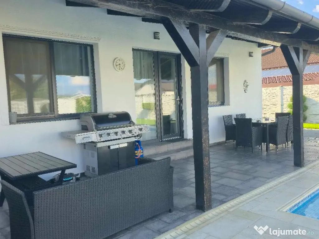 Cora Proiect Imobiliare va propune spre vanzare casa situata in Santandrei, in zona de intrare a localitatii, mai exact in spate la Mega Image, strada asfaltata , construita in regim parter, intrare auto- garaj si piscina incalzita. Disponibila la vanzare dar si schimb cu apartament nou, 3 camere, minim doua dormitoare, loc de parcare subteran sau exterior. Imobilul este finalizat in anul 2021, cu o amprenta bine definita asupra designului si dotarilor printr-o amenajare armonioasa, imaginile din fotografiile atasate fiind sugestive, toate acestea la un loc facand din aceasta casa un ambient primitor, imbietor. Suprafata terenului aferent acestui imobil este de 505 mp impreuna cu amprenta la sol, frontul stradal este generos, curte bine amenajata cu gazon, spatiu verde, plante ornamentale, sistem de irigatie, piscina 8×4 metri incalzita cu pompa de caldura, terasa de 30 mp in prelungirea casei, poarta automata cu intrare auto si garaj pentru minimum doua masini, anexa magazie. In suprafata construita de 130 mp si suprafata locuibila utila de 110 mp. Compusa din: hol de intrare, living cu loc de servit masa cu bucatarie in spatiu deschis, camara de alimente, 3 dormitoare, unul matromonial cu baie proprie, baie pe hol. Compartimentarea este foarte bine definita , doua dormitoare cu orientare stradala, adica vest, un dormitor matrimonial cu orientare rasarit, unul dintre dormitoare avand baie proprie cu intrare directa din dormitor, baie mare cu vana si fereastra, , iesire in terasa de 30 mp, acoperita cu loc de grill/profesional, loc de relaxare si luat masa.