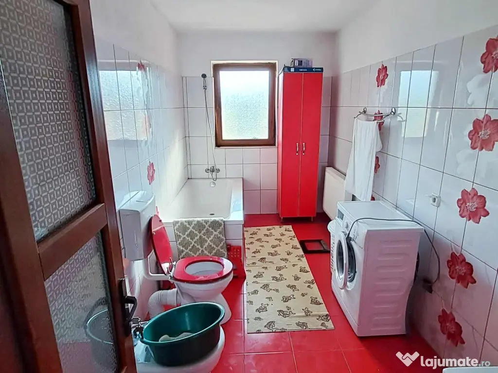 - Baie mare cu cadă, duș, WC, bidet și geam foarte mare.