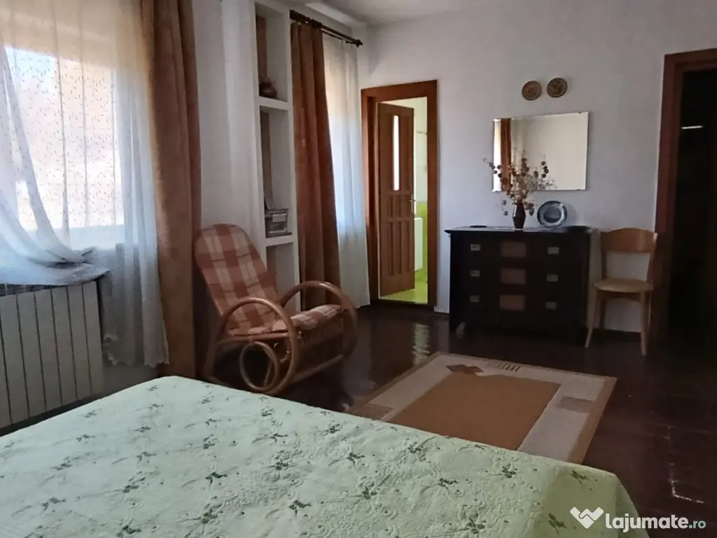 La parter avem bucătărie o cameră de servit masa, o terasă sub terasa de la etaj,o toaletă de serviciu si un hol către scara de acces la etaj si către intrarea din casa in garaj. Mai avem garajul cu ușa electrică cu telecomandă.