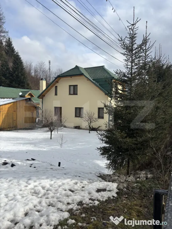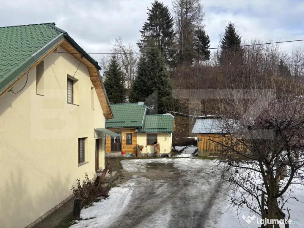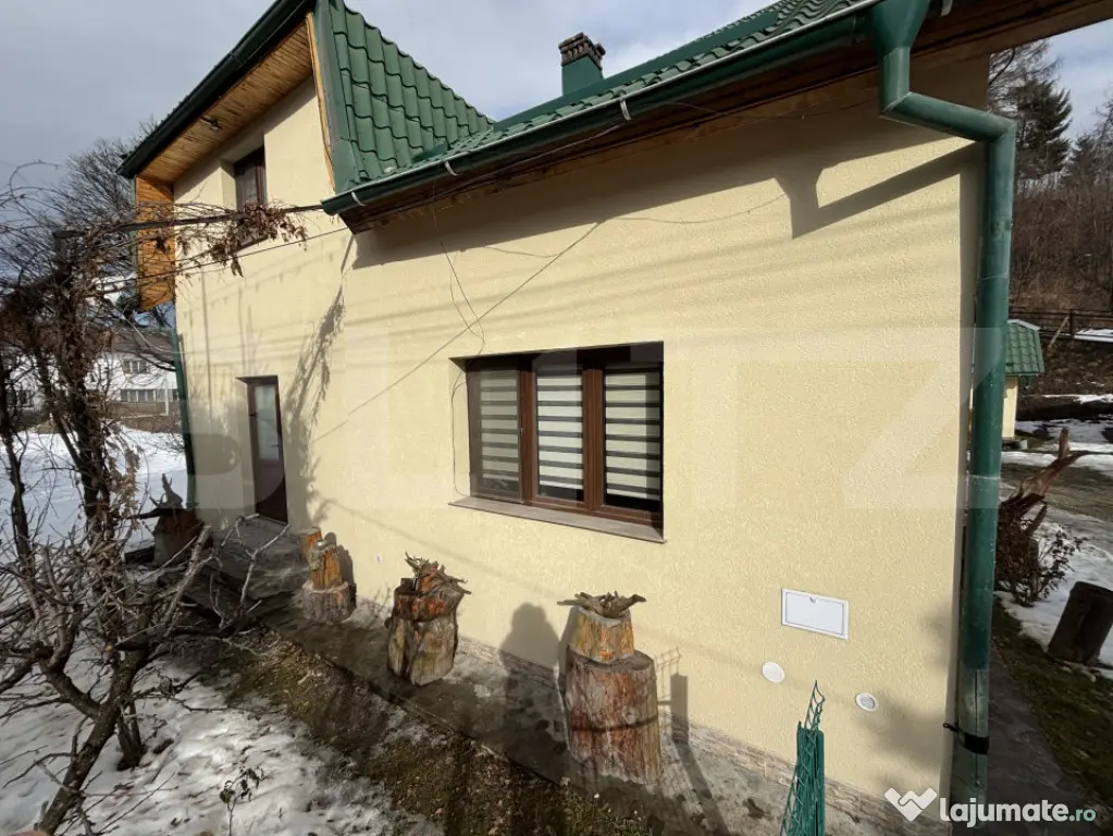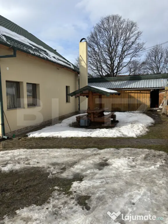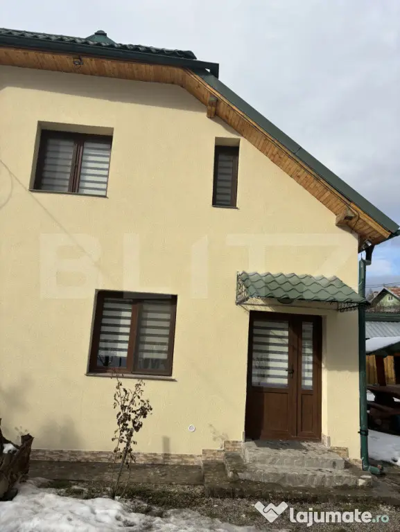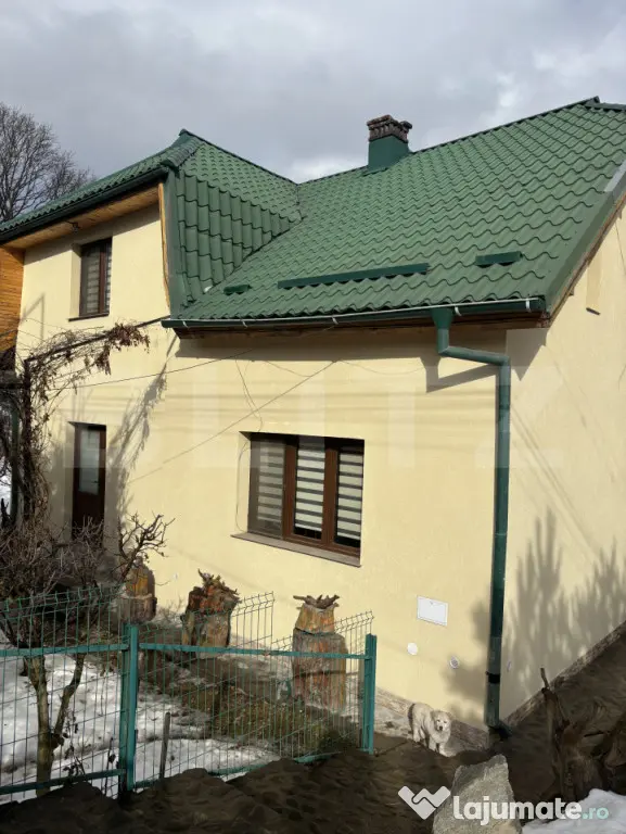 Construcția este realizată din bârne cioplite, ceea ce conferă casei un farmec aparte, autentic montan, dar și o bună eficiență termică. În vara anului 2025, imobilul a beneficiat de izolație termică exterioară, realizată cu cadru metalic și polistiren de 10 cm, un avantaj major în ceea ce privește confortul și costurile de întreținere.