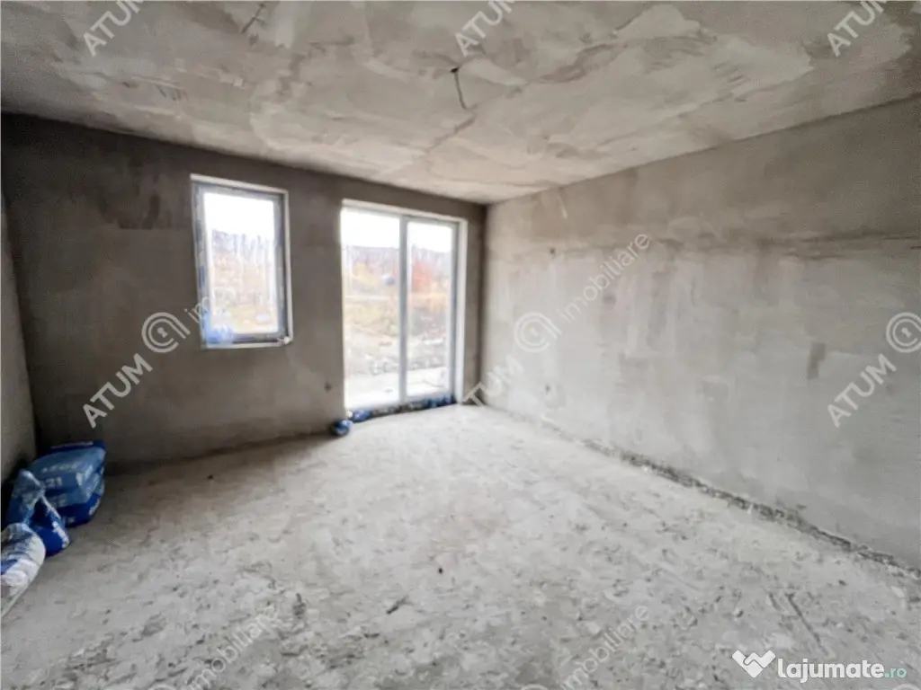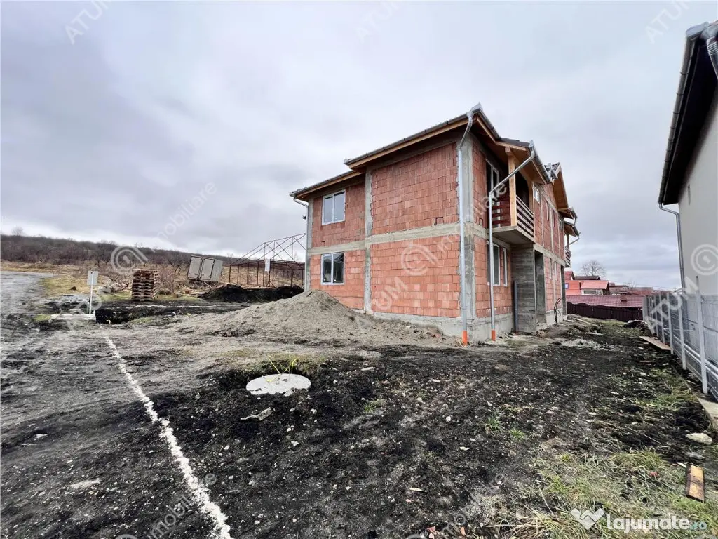 De vanzare casa cuplata in regim de Duplex, compusa din 5 camere, 2 bai, amplasata pe un teren de 255 mp si regim de inaltime P 1E, situata in localiatea Cisnadie din orasul Sibiu. Locuinta are suprafata utila de 126 mp, distribuita pe parter si etaj, astfel: la parter avem un hol de acces cu spatiu pentru cuier si pantofar, living cu bucatarie de tip open-space, dormitor, birou, baie si casa scarilor care face accesul la etajul superior unde gasim 3 dormitoare, baie si hol. Separat de sprafata utila mai beneficiaza de o terasa spatioasa de aproxomativ 14 mp si 2 balcoane. Imobilul este amplasat pe un teren de 255 mp, cu amprenta la sol de 93 mp si curte libera de 162 mp. Dotarile de care beneficiaza imobilul sunt: usa de acces din PVC cu geam termopan, tamplarie PVC cu geam termopan, zidarie din caramida Porotherm de 30 centimetri la exterior, izolatie exterioara de 10 centimetri si zugraveala decorativa alba, centrala termica, incalzire prin pardoseala. Casa se preda la stadiul ce cheie la exterior si gri la interior. Valoarea de achizitie a imobilului este de 168.000 euro, negociabil. ID intern: 2567. Număr Băi: 2 Posibilitate parcare: Da Nr. locuri parcare: 2 Curent Apă Canalizare Gaz