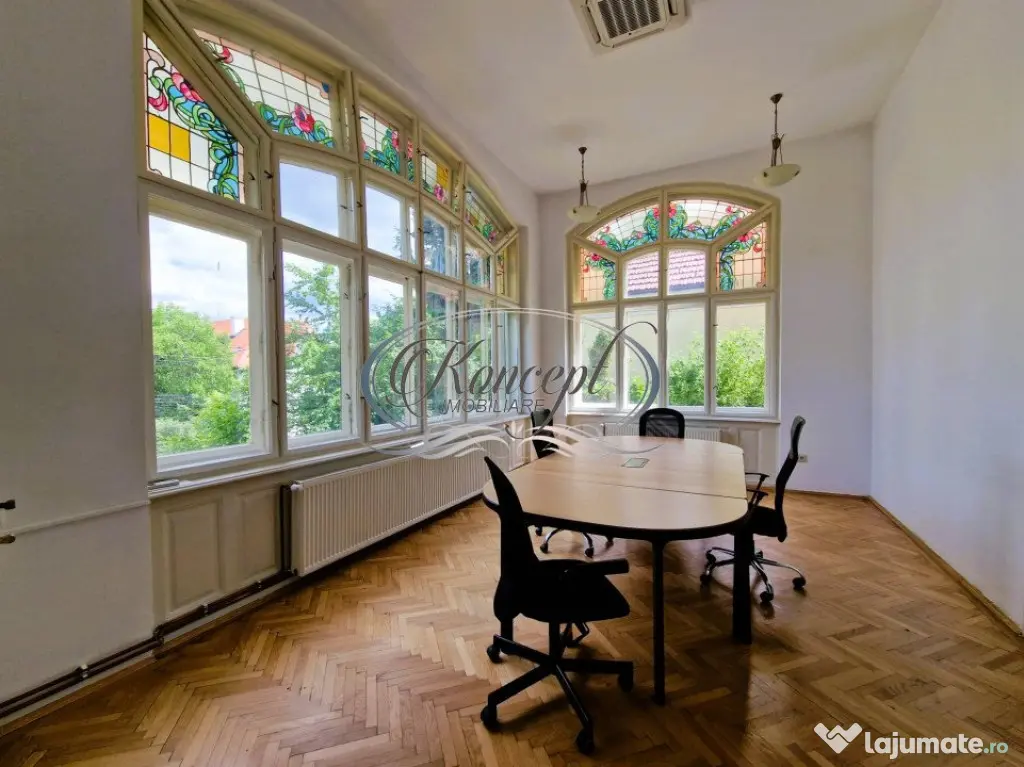Koncept Imobiliare va ofera spre inchiriere o casa exclusivista pentru activitati de birouri, situata in cartierul Gruia, la doar cateva minute de centrul orasului. Casa, in suprafata utila de 504 mp, si terenul aferent de 2.872 mp, este dispusa pe 3 niveluri (D+P+M) si este compartimentata astfel: Demisol - 3 camere, chicineta, grup sanitar, spatiu tehnic, spatiu depozitare si casa scarii; Parter - 8 camere, chicineta, 2 grupuri sanitare, hol si casa scarii; Mansarda - 6 camere si 2 grupuri sanitare. Casa dispune de finisaje de exceptie si este dotata cu 3 centrale termice, aer conditionat, acces securizat, sistem antiefractie, videointerfon, automatizare porti si dispune de cca. 15 locuri de parcare. Datoritza zonei si compartimentarii, casa se preteaza perfect pentru un cabinet de avocatura, birou notarial sau alte activitati de birouri. Pentru detalii complete, pentru programarea unei vizionari sau pentru a afla oferta noastra completa nu ezitati sa ne contactati telefonic, prin e-mail sau la sediul agentiei noastre, pe str. Aviator Badescu nr. 19, Cluj Napoca.