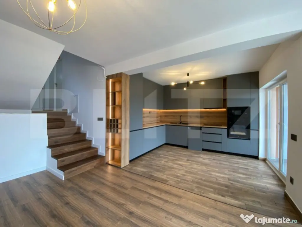 Blitz vă propune spre vânzare o casă modernă, situată într-o zonă liniștită din Apahida intr-un cartier rezidential, cu o panoramă superbă asupra orașului. Această locuință impresionează prin compartimentarea sa inteligentă și finisajele de calitate superioară. Caracteristici principale: ✅ Parter: Bucătărie complet mobilată și utilată cu electrocasnice de top (plită, hotă, cuptor și cuptor cu microunde încorporate în mobilier premium). Living spațios și luminos. Baie modernă. Garaj încălzit, cu posibilitatea de a fi transformat în cameră. ✅ Etaj: 3 dormitoare confortabile. 2 băi elegante. 3 balcoane cu vedere panoramică. Dotări și avantaje: ✔ Încălzire în pardoseală inclusiv în garaj. ✔ Scarile interioare din lemn masiv. ✔ Centrală termică Viessmann de înaltă calitate. ✔ Instalație pregătită pentru montarea camerelor de supraveghere. ✔ Priveliște spectaculoasă asupra orașului. Aceeași casă este disponibilă și în varianta semifinisată la prețul de 172.000 euro. O oportunitate unică pentru cei care caută o locuință modernă, confortabilă și bine poziționată! Cod ofertă / ID BLITZ: P142839 Id intern: P142839 Număr Băi: 3 Curent Apă Canalizare Gaz