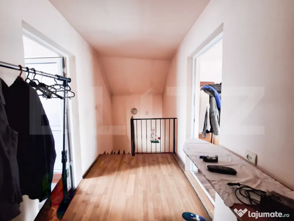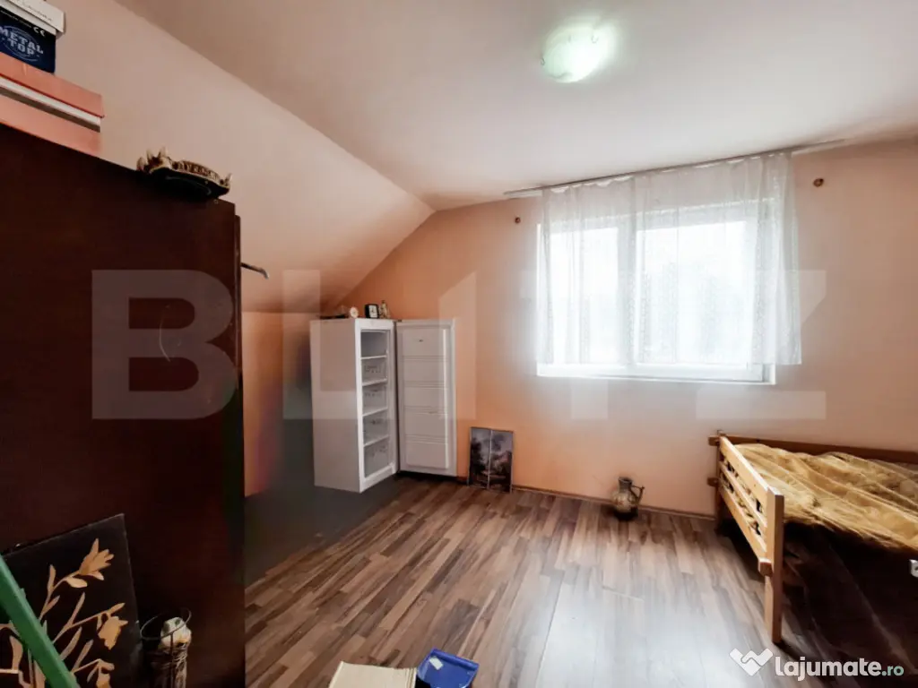 Blitz propune spre vanzare casă individuală P+E, cu grădină generoasă, în Apahida. Construită în anul 2000, casa este amplasată pe un teren de 615 mp și are o suprafață utilă de 100 mp, desfășurată pe un regim de înălțime Parter + Etaj. Realizată pe fundații din beton, cu pereți din BCA, acoperiș tip șarpantă din lemn și învelitoare din șindrilă bituminoasă, construcția oferă o structură solidă și durabilă. Compartimentare: - Parter: 1 cameră, 1 baie, 1 hol cu casa scării și un living generos - Etaj: hol cu casa scării, 2 camere și un balcon. Proprietatea dispune de o curte spațioasă, ideală pentru relaxare, grădinărit sau timp petrecut în aer liber. Acces facil spre oraș, dar suficient de retrasă pentru a te bucura de liniște și intimitate. Cod ofertă / ID BLITZ: P156187 Id intern: P156187 Număr niveluri imobil: 1 Număr Băi: 1 Curent Apă Canalizare Gaz