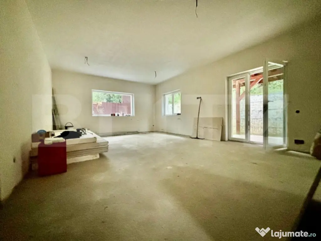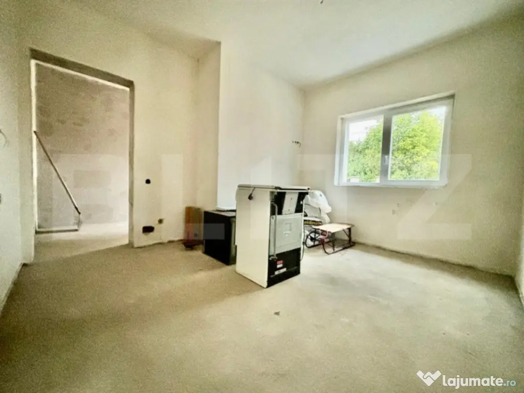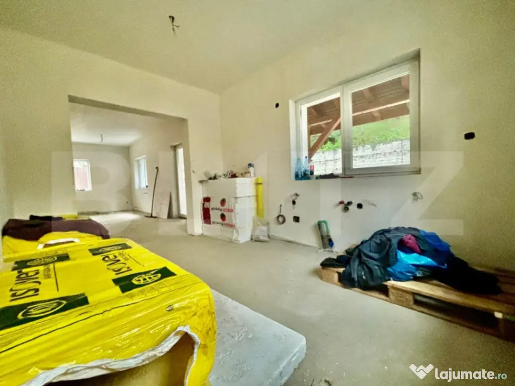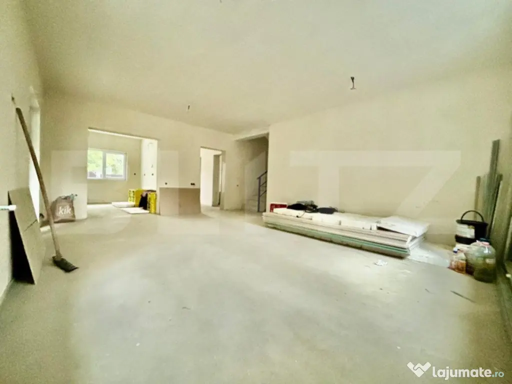 Suprafata de teren aferenta imobilului este de 580 mp. Casa se preda la stadiul de aproape finisat cu pereți tencuiți si un strat de glet cu plasa in toată casa, pereți exterior izolați și dati cu decorativa, gard complet