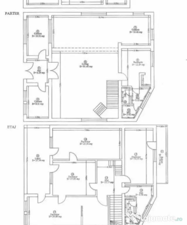 Parter : hol cu casa scarii, 2 grupuri sanitare, 3 camere, living , bucatarie