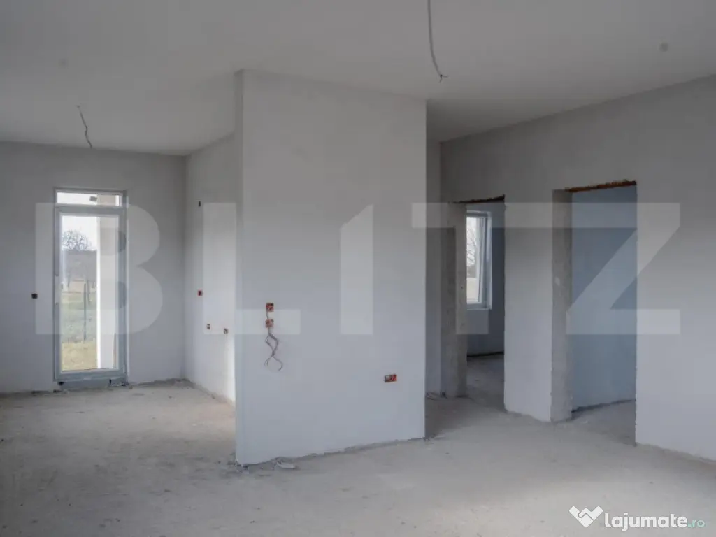 Blitz va propune o casa individuala, pe parter cu 2 fronturi stradale situata in Padureni, intr-o zona noua de case, strada asfaltata, la max 15min cu masina de Timisoara. Casa este amplasata pe un teren de 404mp, se desfasoara pe o suprafata utila de cca 100 mp dispune de 2 dormitoare, din care un dormitor matrimonial cu baie proprie, un birou, un living spatios + bucatarie, baie si o terasa acoperita de 22mp. Beneficiaza de toate utilitatile apa, canalizare, curent trifazic prin reteaua localitatii iar pentru confortul termic este prevazuta incalzire in pardoseala, cu alegerea de catre clientul cumparator a sursei de caldura, montarea centralei si a sistemului de incalzire fiind incluse in pret. Casa se vinde semifinisata la interior si finalizata pe exterior cum se vede în poze, la pretul afisat sau la cheie cu pretul de 125 000 EUR cu posibilitatea alegerii finisajelor intr-un buget alocat cu termen de executie de maxim 2 luni. In apropiere exista statie pentru mijloace de transport in comun spre Timisoara ( M51) Pentru mai multe detalii si organizarea unei vizionari contactati echipa Blitz! Cod ofertă / ID BLITZ: P99753 Id intern: P99753 Număr Băi: 2 Nr. locuri parcare: 3